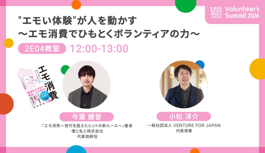 そんな「Volunteer’s Summit 2026」に、僕と私と株式会社代表の今瀧健登の登壇が決定。「社会とつながるボランティア」をテーマとしたプログラム内のセッションにて、一般社団法人VENTURE FOR JAPAN代表理事・小松洋介氏とともに、“エモい体験”が人を動かす理由を、ボランティアの視点から考えます。