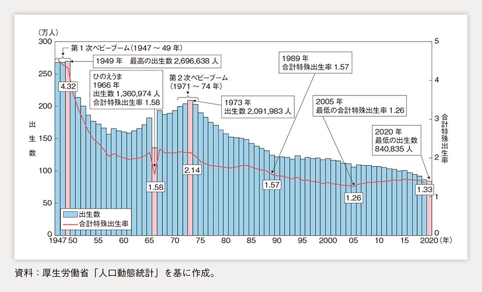 日本では現在、少子化問題が深刻化しています。1947年の第1次ベビーブームから2020年までで出生数が約1/3以下に減少しており(内閣府 第1部 少子化対策の現状より)、少子化問題が深刻化すると、労働力の減少や社会保障の持続性の懸念につながっていきます。