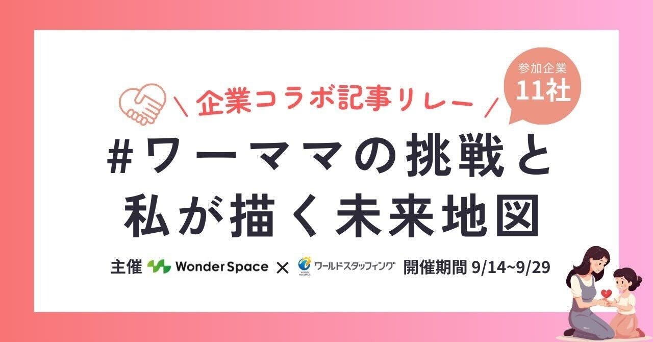 株式会社WonderSpace(本社:東京都港区、代表取締役社長:山本 尚宏)、株式会社ワールドスタッフィング(本社:福岡県福岡市博多区博多駅前 代表取締役:本多信二)共催のもと、「#ワーママの挑戦と私が描く未来地図」をテーマに、オウンドメディアを通して11社で記事をリレー形式で繋ぐ企画を開催します。