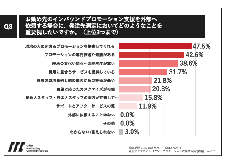 「Q8.お勤め先のインバウンドプロモーション支援を外部へ依頼する場合に、発注先選定においてどのようなことを重要視したいですか。(上位3つまで)」(n=101)と質問したところ、「現地の人に刺さるプロモーションを提案してくれる」が47.5%、「プロモーションの専門技術や知識がある」が42.6%、「現地の文化や関心への理解度が高い」が38.6%という回答となりました。