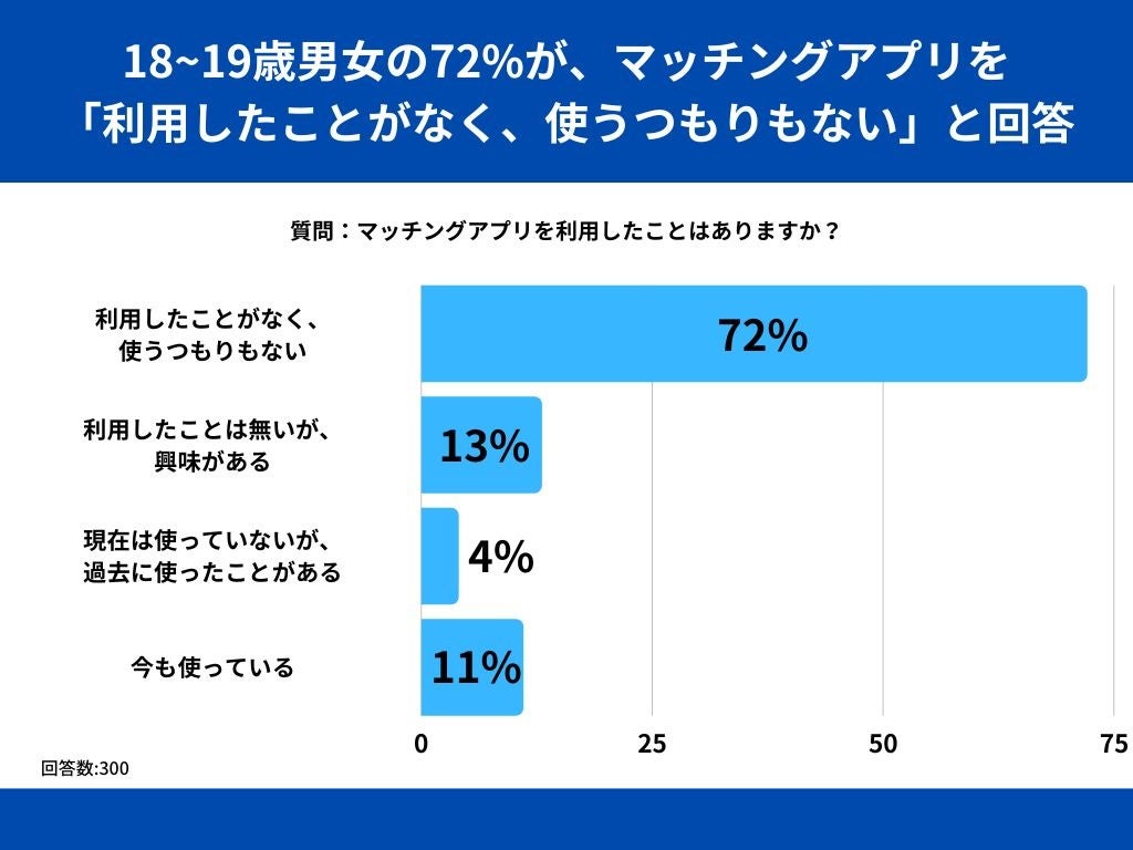 18~19歳男女の72%が、マッチングアプリを「利用したことがなく、使うつもりもない」と回答【マッチングアプリに関するアンケート】