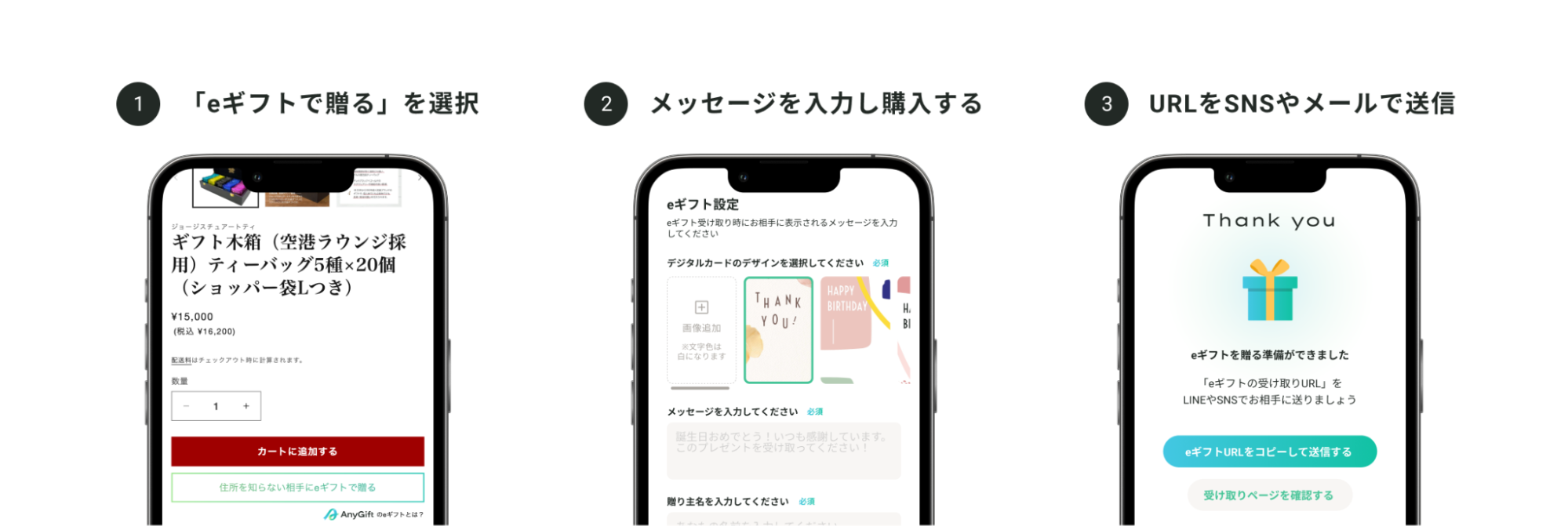 AnyGiftは、相手の住所を知らなくてもLINEやメールで贈ることができる「eギフト機能」を、ECサイトに組み込むことができるサービスです。