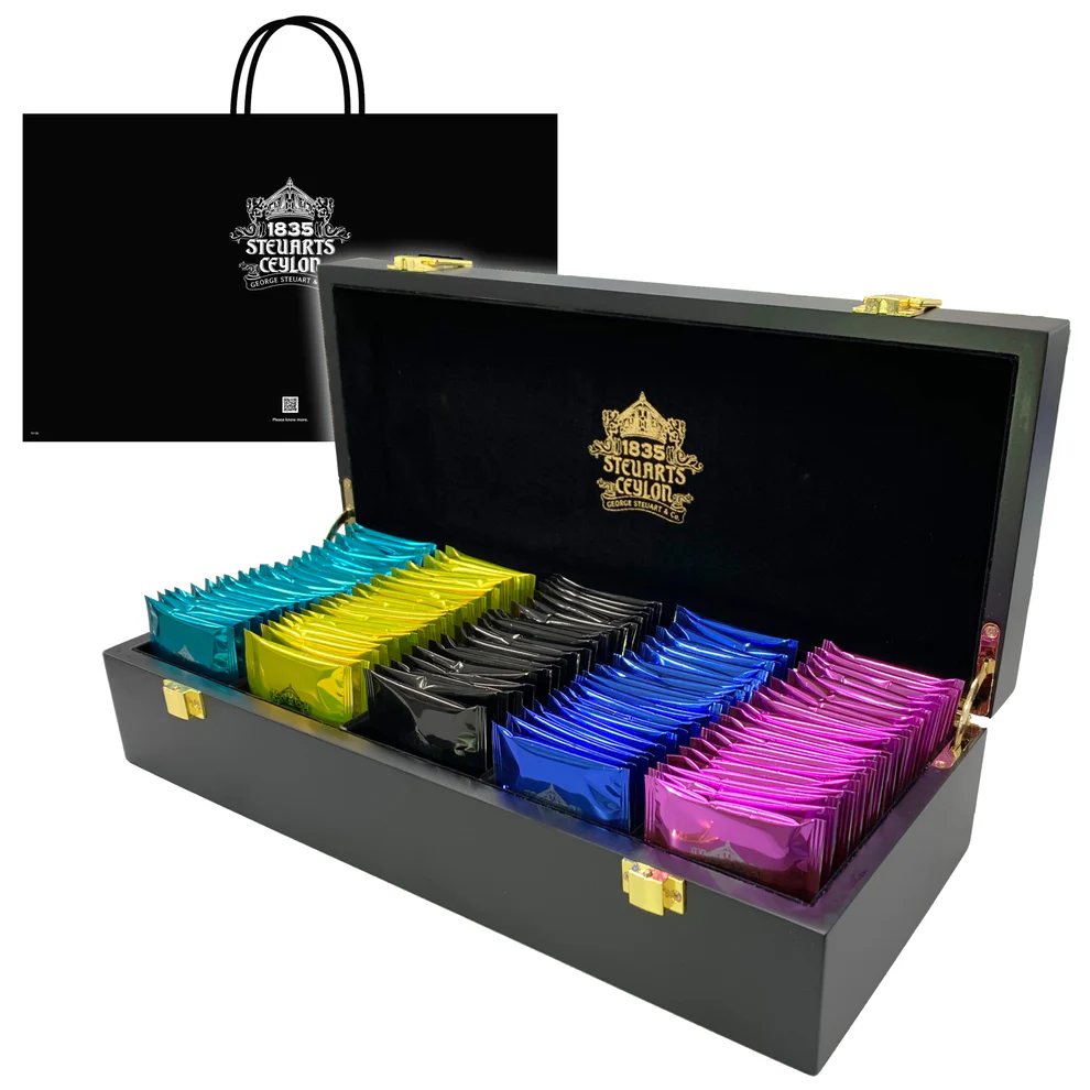 スリランカ最古の紅茶ブランドGeorge Steuart Teaのロゴがあしらわれた木箱とともに、5種類の紅茶(ティーバッグ)を20杯ずつ、計100杯分の紅茶を楽しめるギフトです。