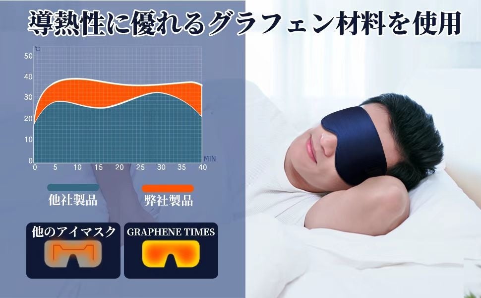 GRAPHENE TIMESホットアイマスクで使用するグラフェンは、安っぽい銅発熱配線に比べて、より薄く、強靭で、電導性に優れた素材です。電源をオンにしたら、グラフェン発熱フィルムが迅速に発熱し、10秒以内にすぐ温まります。
