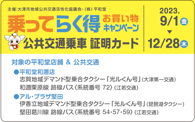 【平和堂ホーム・サポートサービス×大津市地域公共交通活性化協議会】公共交通に乗って平和堂でお買い物!乗ってらく得 お買い物キャンペーン