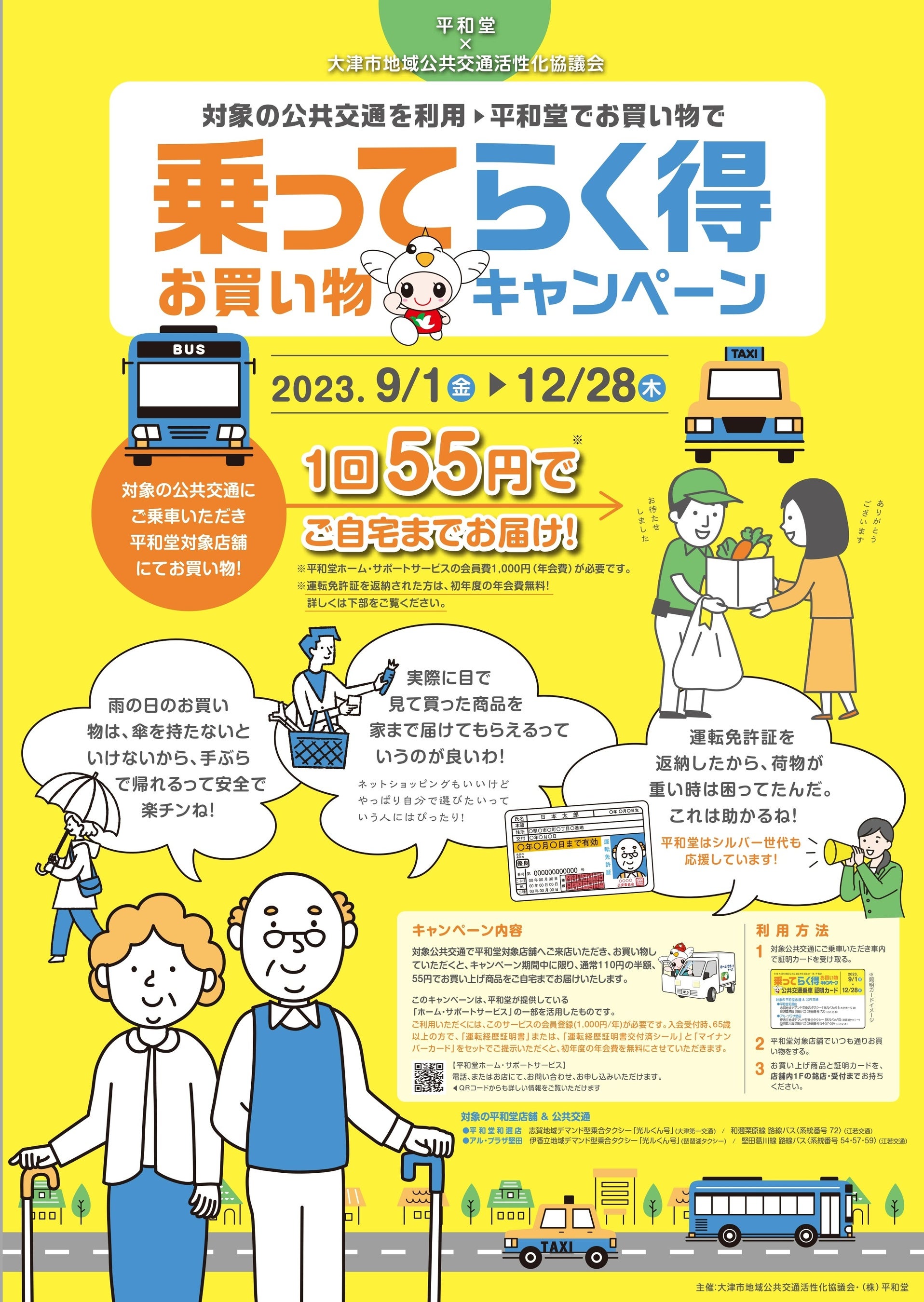 ・対象公共交通で平和堂対象店舗へご来店いただき、お買い物していただくと、キャンペーン期間中に限り、通常110円の半額、55円で、お買い上げ商品をご自宅までお届けいたします。