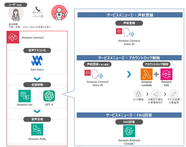 ・テキストをリアルな音声に変換するAmazon Pollyによる回答を、自然で理解しやすい形に整えるためにAmazon Bedrock上でClaude※3を活用し、ユーザーにとって分かりやすく正確なサービス提供を可能としています。