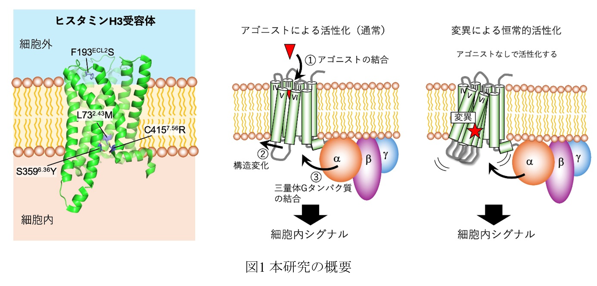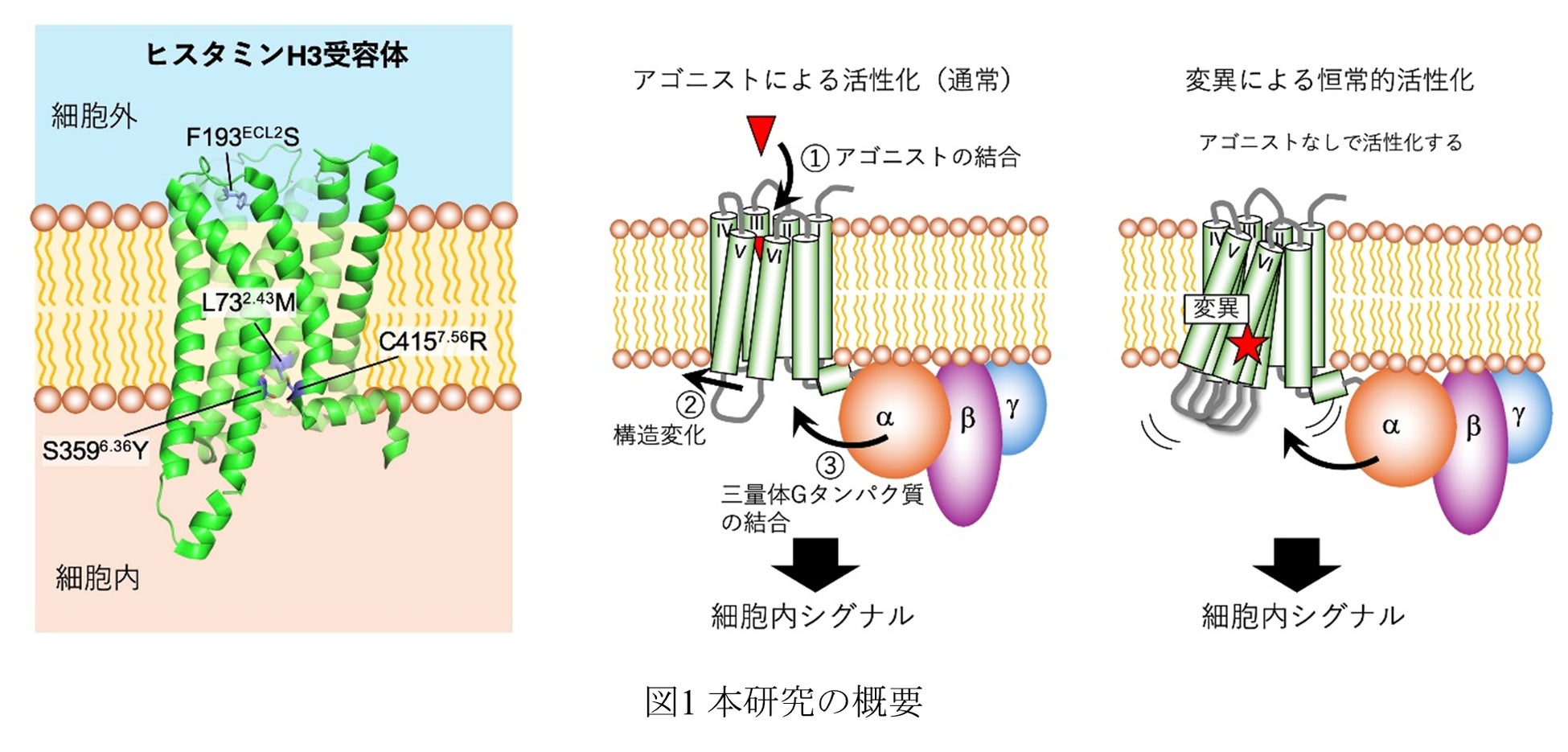 Gタンパク質共役型受容体(GPCR)の一種であるヒスタミンH3受容体(H3R)において、4つのアミノ酸変異(L732.43M、F193ECL2S、S3596.36Y、C4157.56R)が恒常的活性を著しく増強することを明らかにしました。