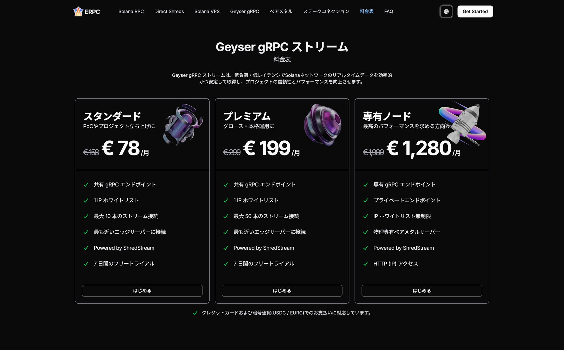 主要データソースとのネットワーク距離をさらに縮めるとともに、市場最高クロック帯のCPUを積極的に採用し、Solana向けの低レイテンシ環境を一段と強化しています。