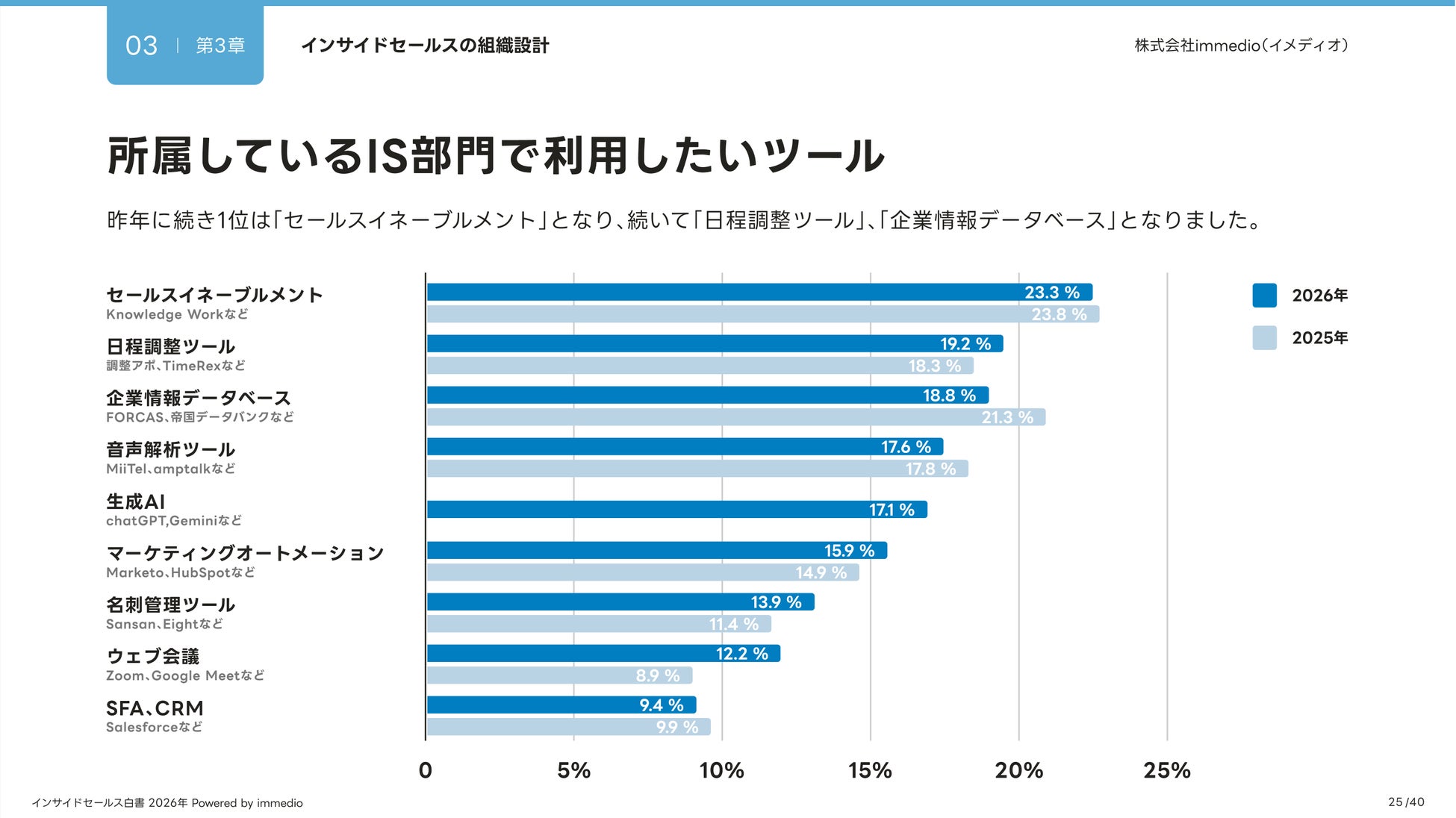利用ツールの構成に大きな変化はないものの、生成AIの業務活用が定着。 今後利用したいツールは引き続きセールスイネーブルメントがトップ。