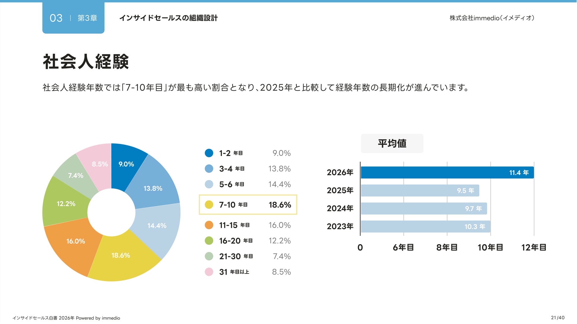 部門のメンバー数は平均7.7名とやや増加し、社会人経験や在籍期間も長期化。