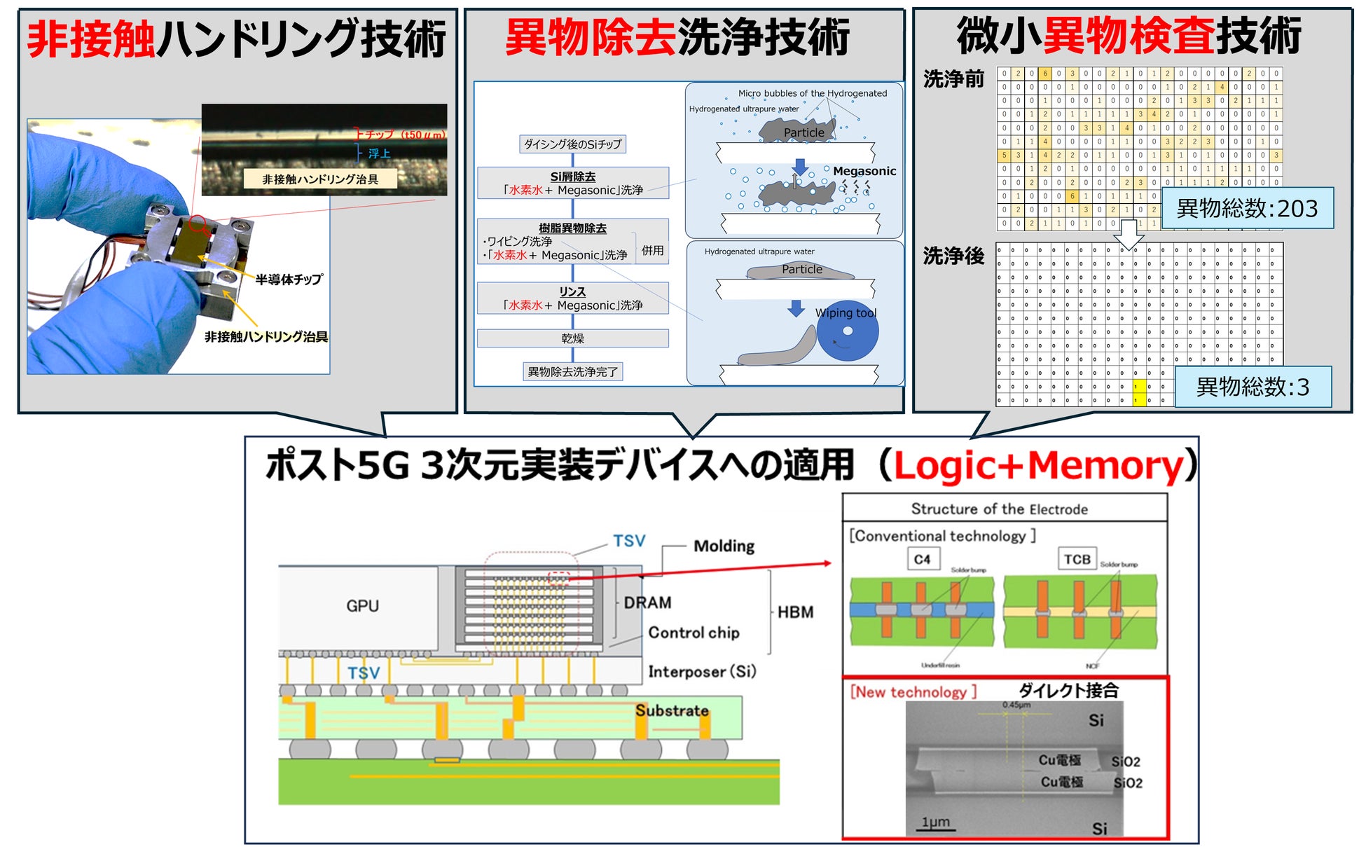 近年、AIの進化に伴い必要とされる先端デバイスは複数の半導体チップを3次元で実装するなど、後工程で高性能化を実現することへの期待が高まっています。高機能化・高速伝送化のため、電極間の挟ピッチ化と低抵抗化などの要求や実装の多積層化の進展によるチップの薄型化への対応が求められていますが、積層実装する半導体チップ表面の異物が接合品質に影響して歩留まりを下げ、実用化の障害になっています。今回の成果はこの課題を解決するもので、半導体チップ接合表面に残留するサブミクロンサイズの異物を除去し、清浄な状態を維持したまま搬送して接合することを可能とします。
