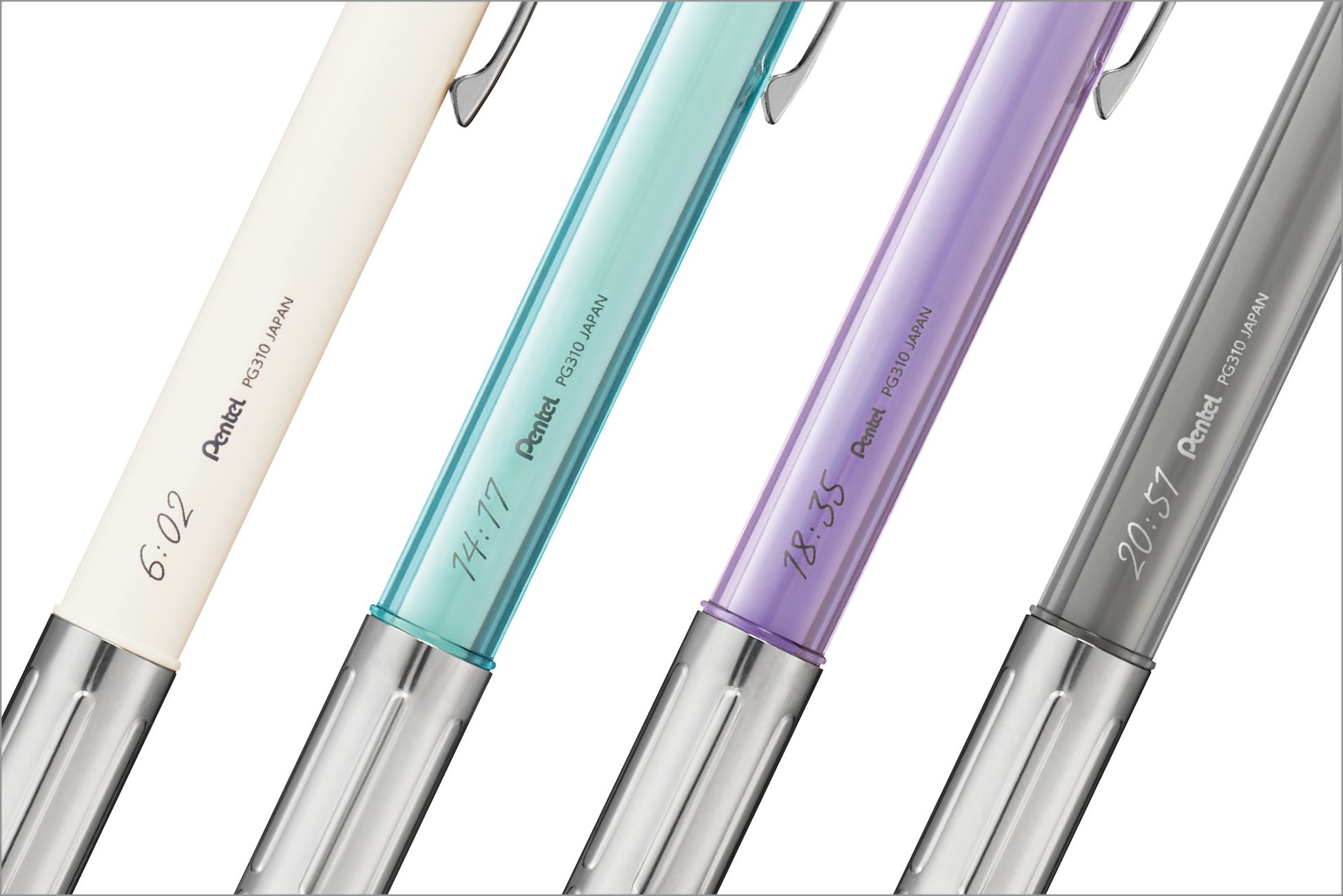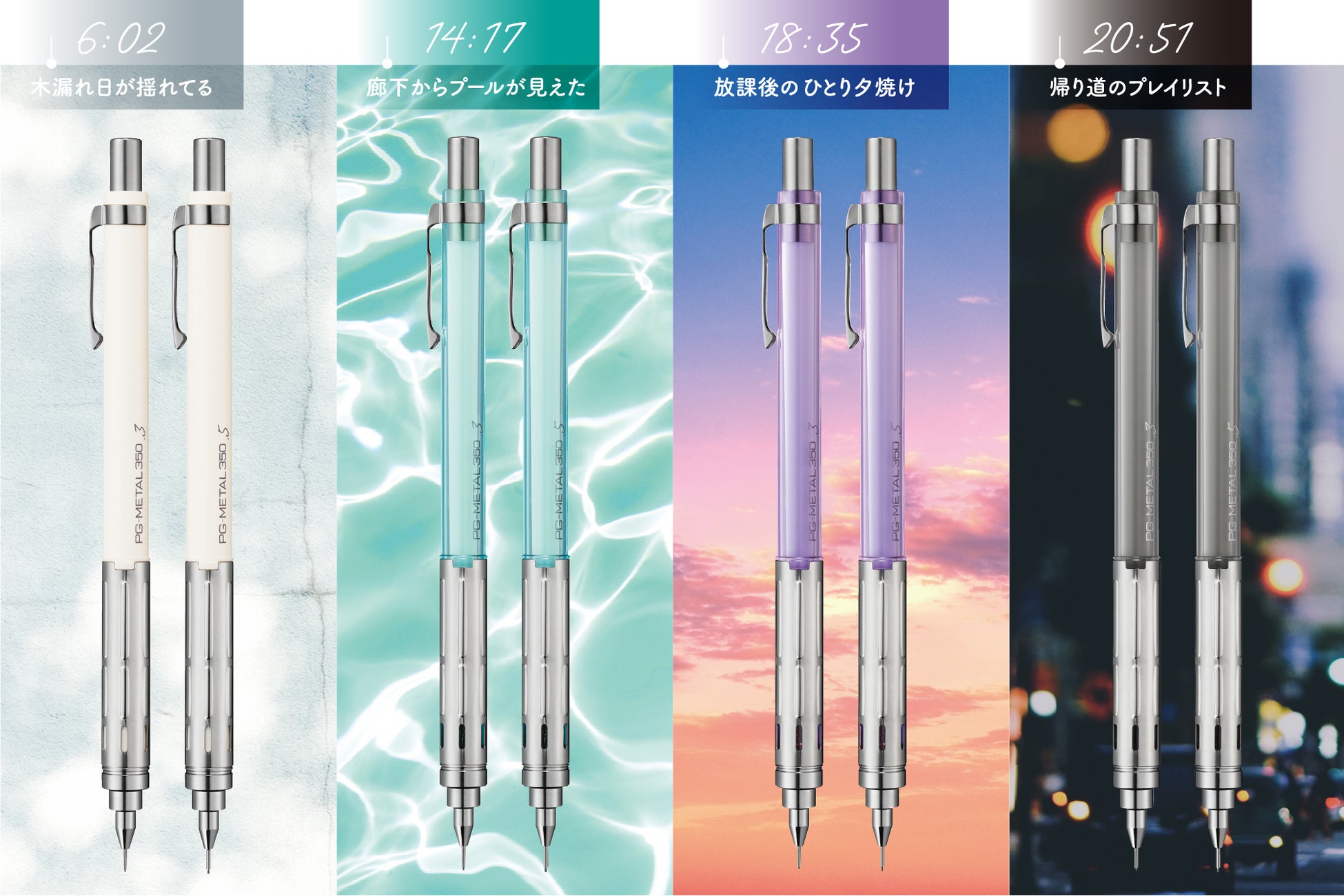 1日を4つの時間帯にわけ、それぞれの情景を表現したカラーリングを採用しました。ボディの裏側には、心が動く瞬間の「時刻」を印字しています。不透明軸のオフホワイトと、透明軸のクリアミントブルー、クリアパープル、クリアグレーの4種のデザインがあり、いずれも芯径は0.3㎜と0.5㎜をラインナップしています。