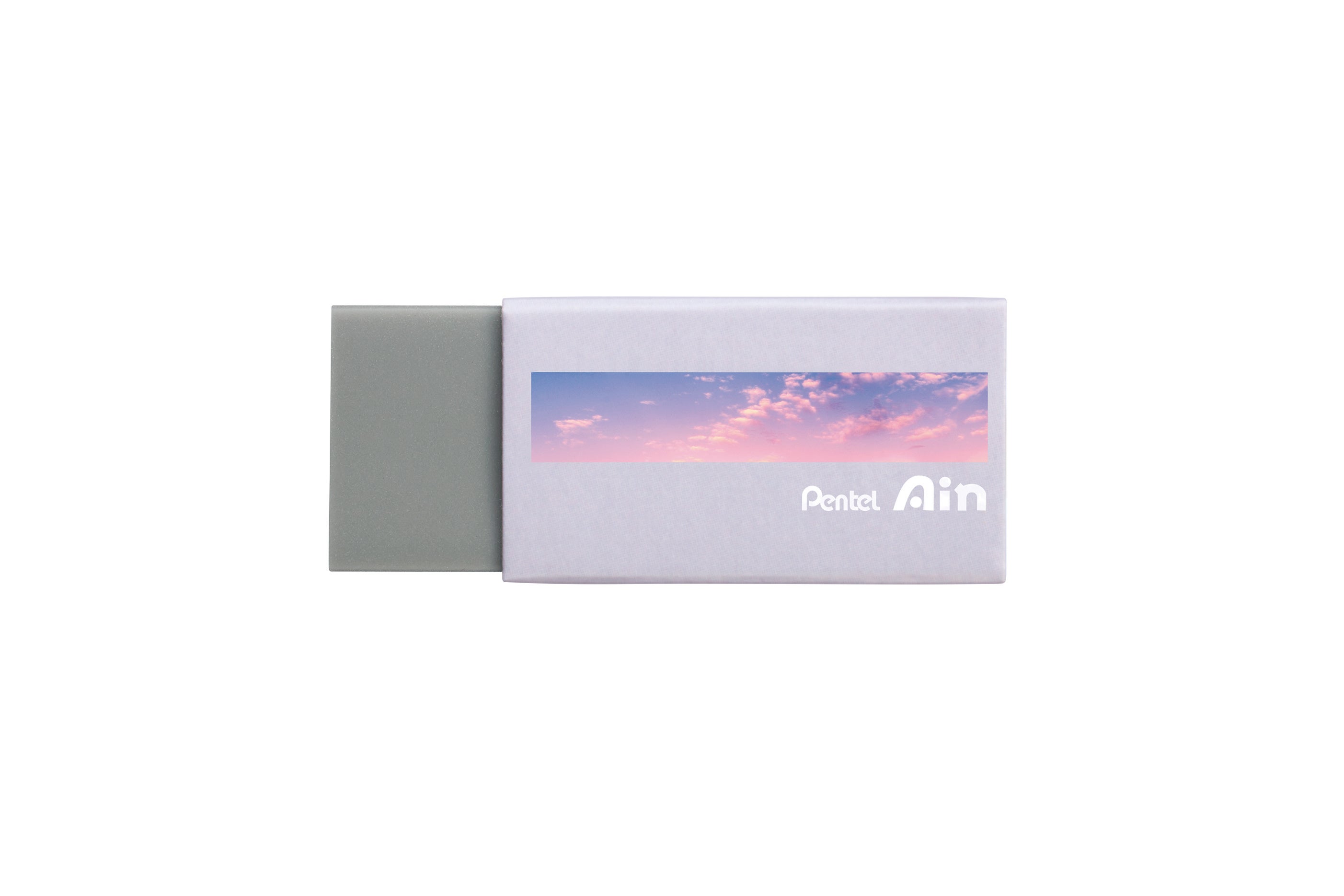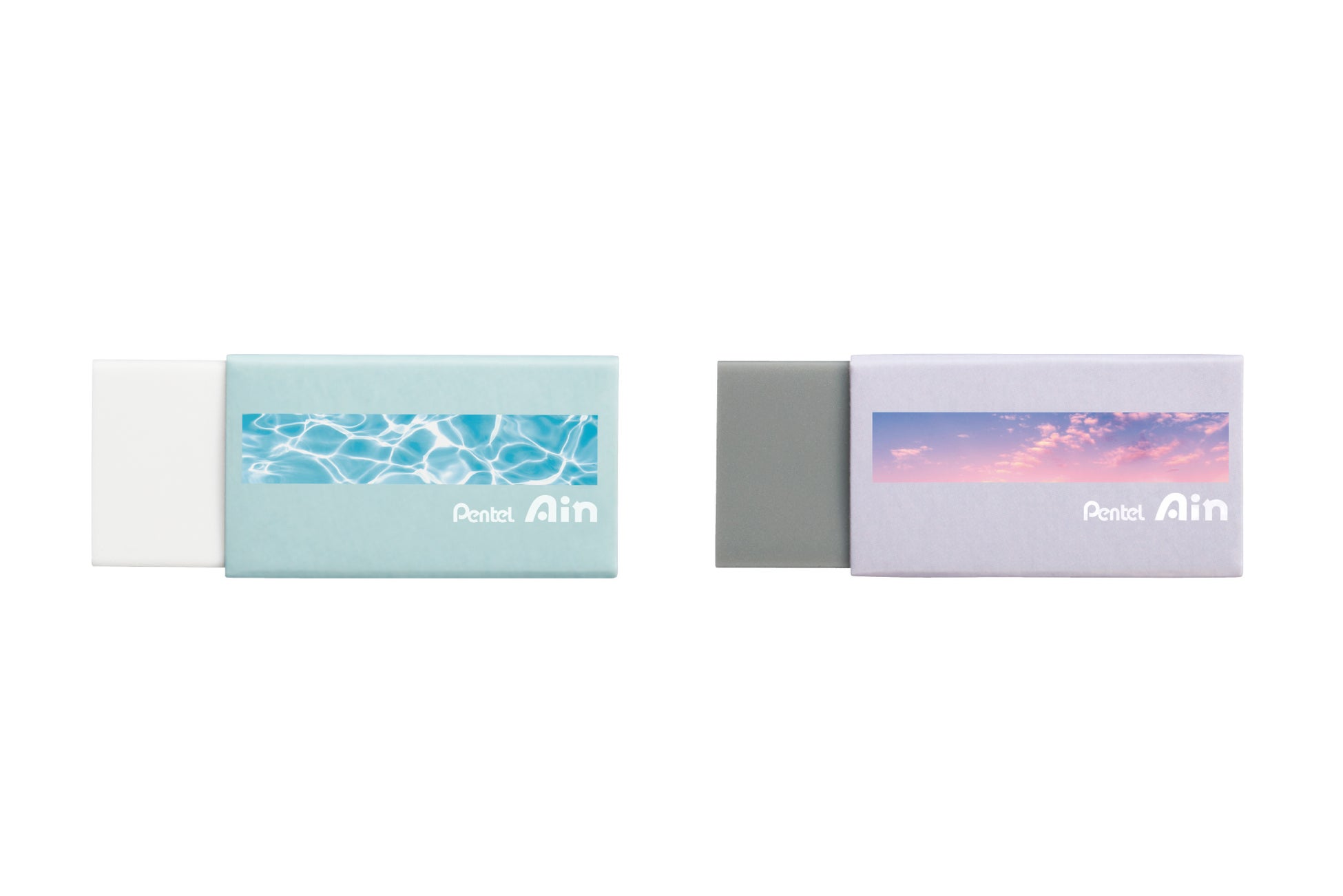 ミントブルーとパープル2種類のスリーブに、それぞれ白とグレーの消しゴムを合わせました。