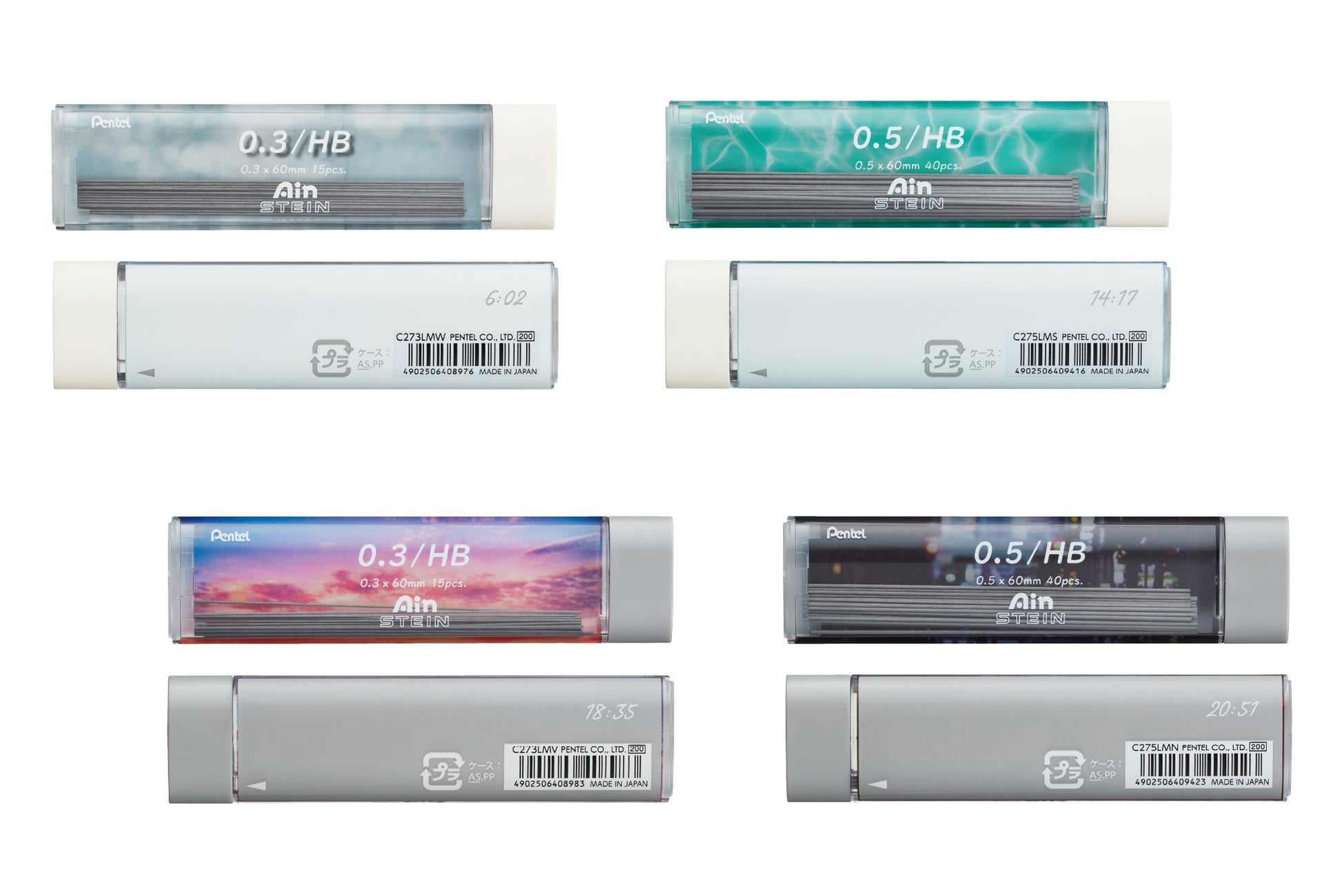 替芯のケースは、内側に施された「心が動く瞬間を切り取ったデザイン」がケース前面のクリア素材から見える限定仕様です。シャープペンと同様に、裏面には心が動く瞬間の「時刻」が印字されています。芯径0.3㎜のケースはオフホワイトとパープル、芯径0.5㎜のケースはミントブルーとグレーの計4色をラインナップしています。「濃さ」と「強さ」を両立しつつ紙面にしっかり定着するため、筆跡や手が汚れにくい替芯です。
