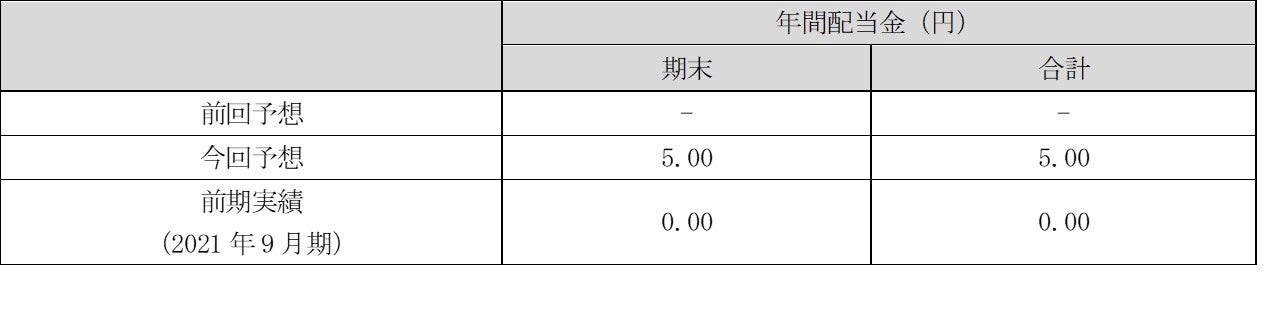 このような状況の中、2022年9月期の配当予想については未定とさせていただいておりましたが、最近の当社業績動向を踏まえ、総還元性向ならびに、株主優待含めた株主総利回りを考慮した結果、1株当たりの年間配当予想を5円に修正(復配)することといたしました。