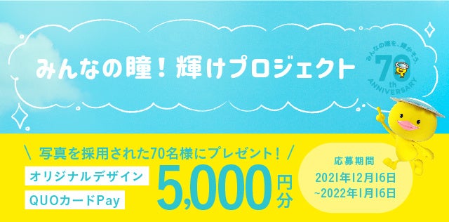 当社は、創業者の田中恭一が日本初の角膜コンタクトレンズの実用化に成功してから、70年を迎えました。これまで支えてくださいました世界中のお客様をはじめ関係するみなさまへの感謝の気持ちを込めて、2022年3月末までを70周年イヤーとして、様々な企画を展開しております。その一環として、メニコングループ社員からアイデアを募集したものを原案とした今企画は、「みんなの瞳!輝けプロジェクト」として、何かを思いっきり楽しんだり、挑戦したり、そんな“瞳が輝く瞬間”の写真を募集します。そして、応募いただいた投稿の中から、採用された写真をムービーにまとめてメニコン公式サイトで発表をいたします。たくさんの“瞳が輝く瞬間”の投稿をお待ちしております。