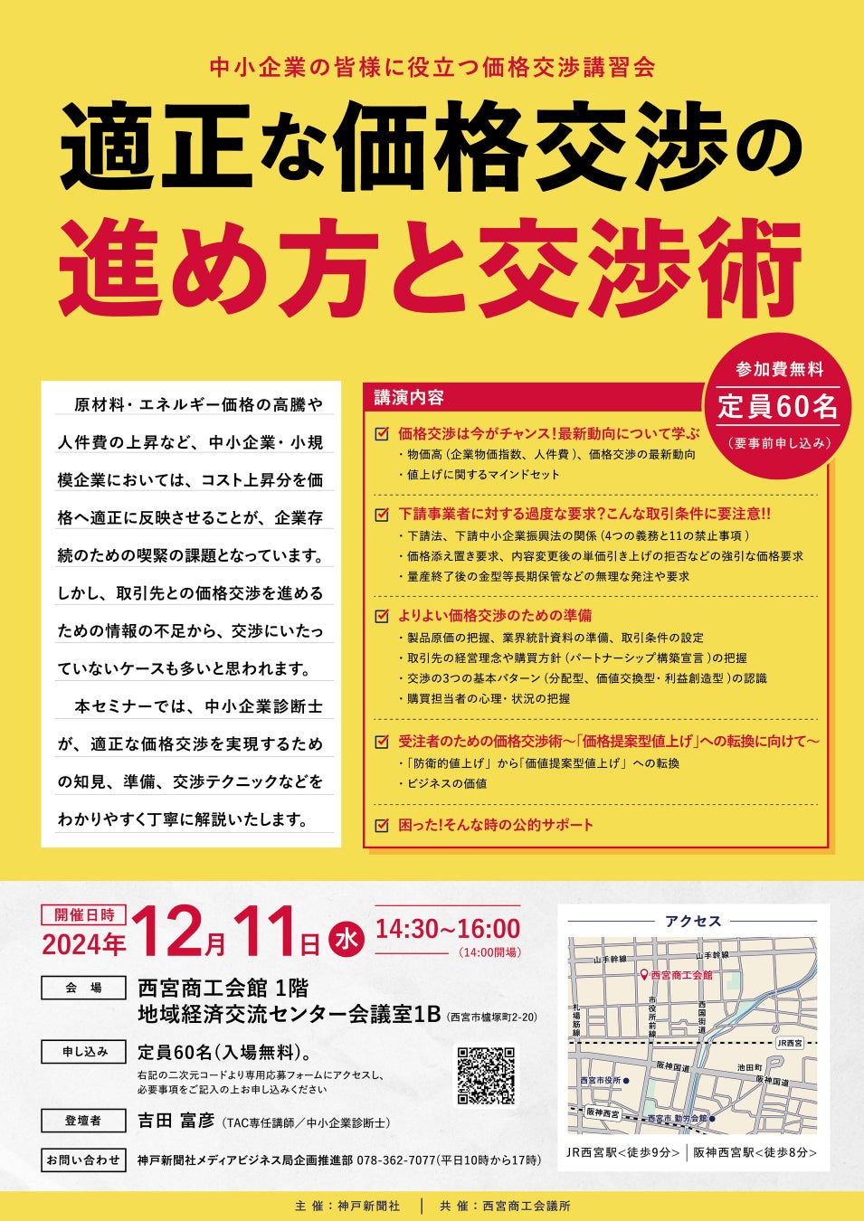 神戸新聞社は、企業が発注先との価格交渉を行う際に役立つ知見や交渉の進め方を中小企業診断士が解説する講習会を開催します。