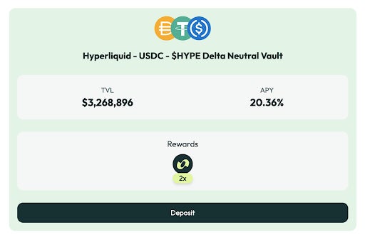 2024年Q3時点で総預かり資産(TVL)100,000ドルを達成し、Delta Neutralボールトやオプション・ホイール戦略など独自の金融商品を展開しています。Ethenaの設計思想を継承しつつ、リアルタイムのパフォーマンス指標と戦略の透明性を特徴としています。Hyperliquidにも対応し、ユーザーに多くにイールド獲得の機会を提供します。