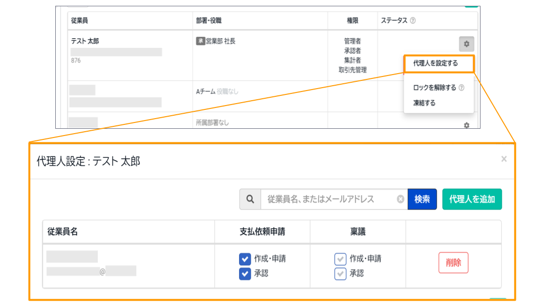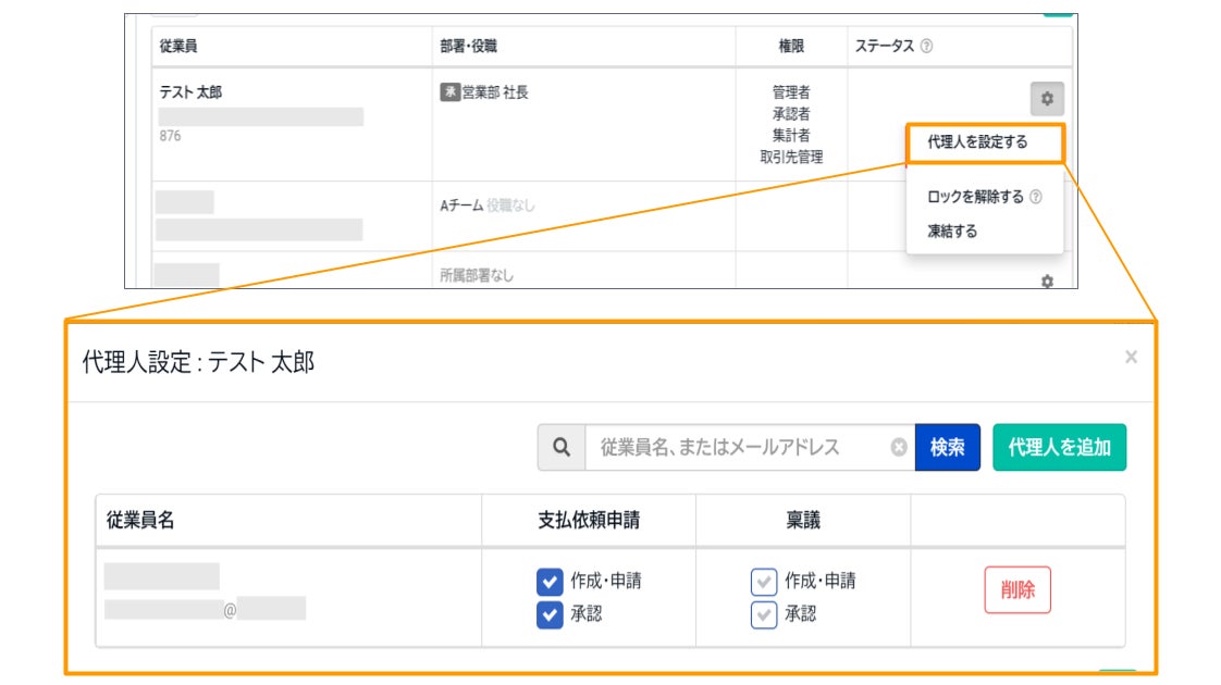 代理人として設定された従業員が請求書支払の申請、承認作業を行うことが可能になりました。これにより、急用や長期休暇期間などで担当者が不在の場合でも、請求書や稟議書の申請や承認作業を代理の方に代わりに行うことができるようになります。