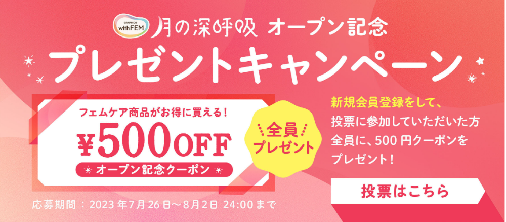 〇「月の深呼吸」新規会員登録&キャンペーン投票に参加でフェムケア商品購入に使える500円クーポンプレゼント!