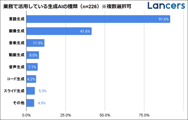 活用されている生成AIの種類では、「言語生成」が圧倒的に多い結果となった。一般的なライティングや翻訳に加え、メール文やアンケート文の作成などさまざまな業務で容易に導入しやすい「言語生成」は、業種やスキルを問わず活用が可能であり、多くの方が利用していることがうかがえる。