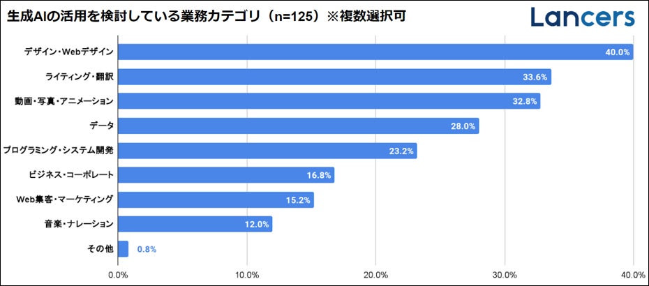生成AIを活用している業務カテゴリは「ライティング・翻訳」が他を大きく引き離してトップとなった。一方で、生成AIの活用を検討している業務カテゴリでは「デザイン・Webデザイン」がトップとなり、「動画・写真・アニメーション」も上位にランクインした。これにより、生成AIのクリエイティブ業務への活用意欲が高まっていることが明らかになった。