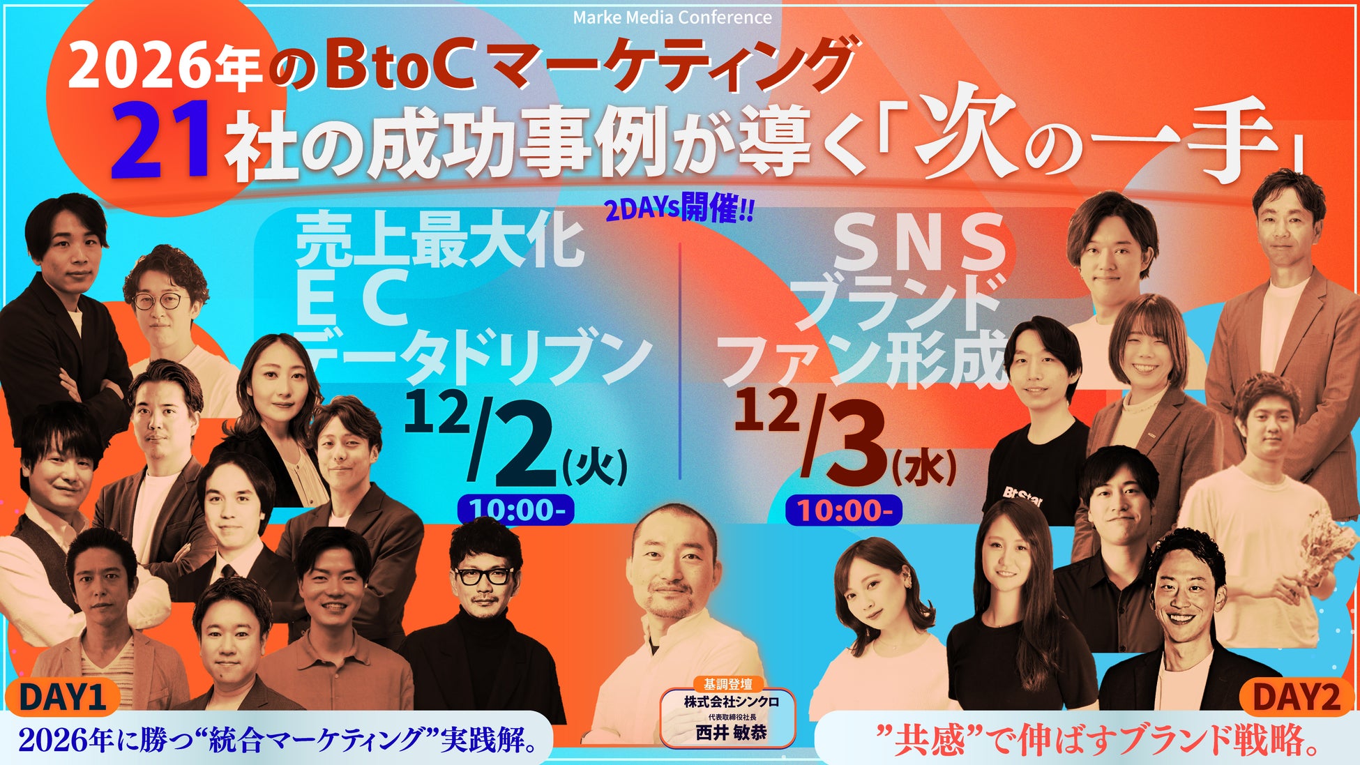 人の力とテクノロジーで再現性のある経営ソリューションを提供する株式会社アイドマ・ホールディングス(本社:東京都品川区、代表取締役:三浦 陽平)の子会社である株式会社マーケメディア(本社:東京都品川区、代表取締役:三浦 和広)が主催するオンラインカンファレンス「2026年のBtoCマーケティング 21社の成功事例が導く“次の一手”」を2025年12月2日(火)、3日(水)に開催することをお知らせします。