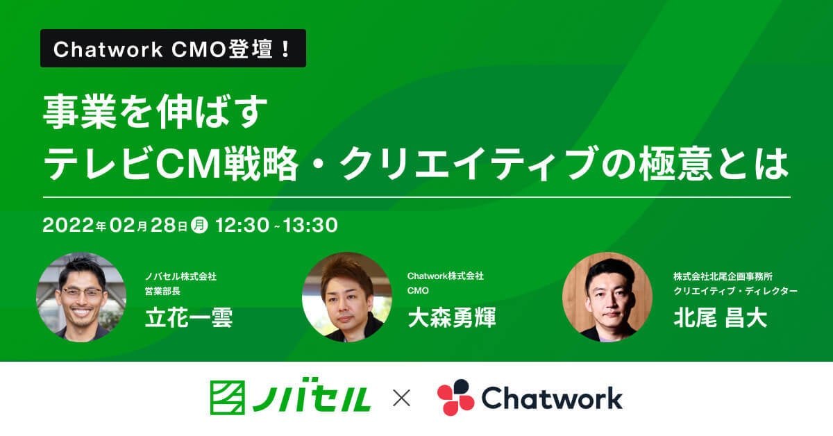 Chatworkが初めてのテレビCM実施に至った意思決定の背景や、実施効果についてお話いただきます。また、弊社のグロースパートナー事業部 マネージャー 立花、クリエイティブディレクターの北尾昌大氏との対談により、ノバセルの戦略に基づき、定量データに紐づいたマーケティング戦略とクリエイティブ制作、メディア戦略について紹介します。
