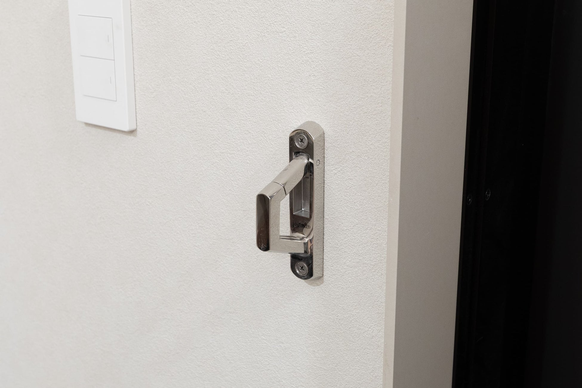 玄関外には散歩帰りにすぐ足を洗える「わんこシャワー」を設置し、玄関ドア脇にはリードフックを備えることで、外出前後の動作がスムーズになるように配慮しました。玄関にはワンちゃん用品をまとめて収納できるシューズインクローゼットを設け、内部には有効ボードを設置することで、必要なアイテムをすぐに取り出せる収納計画としています。