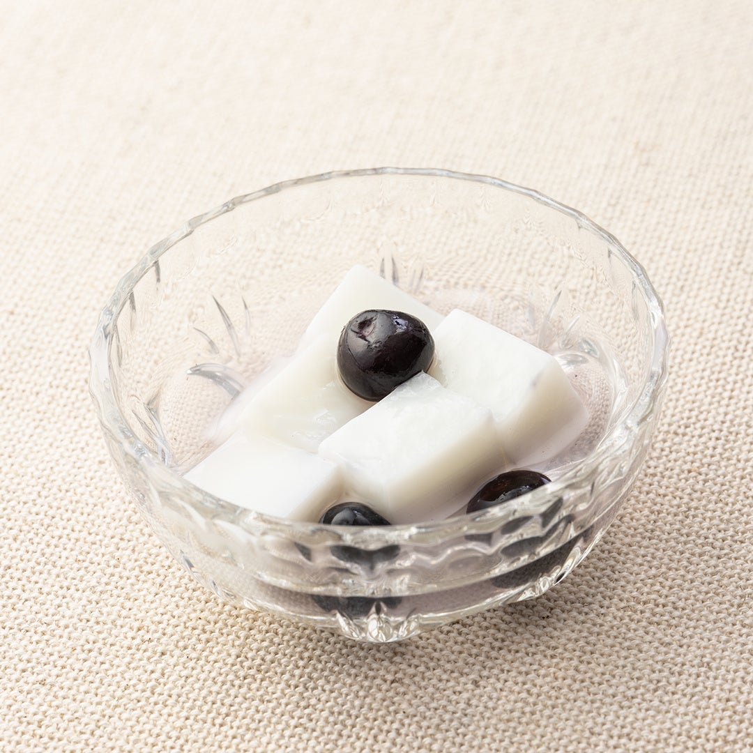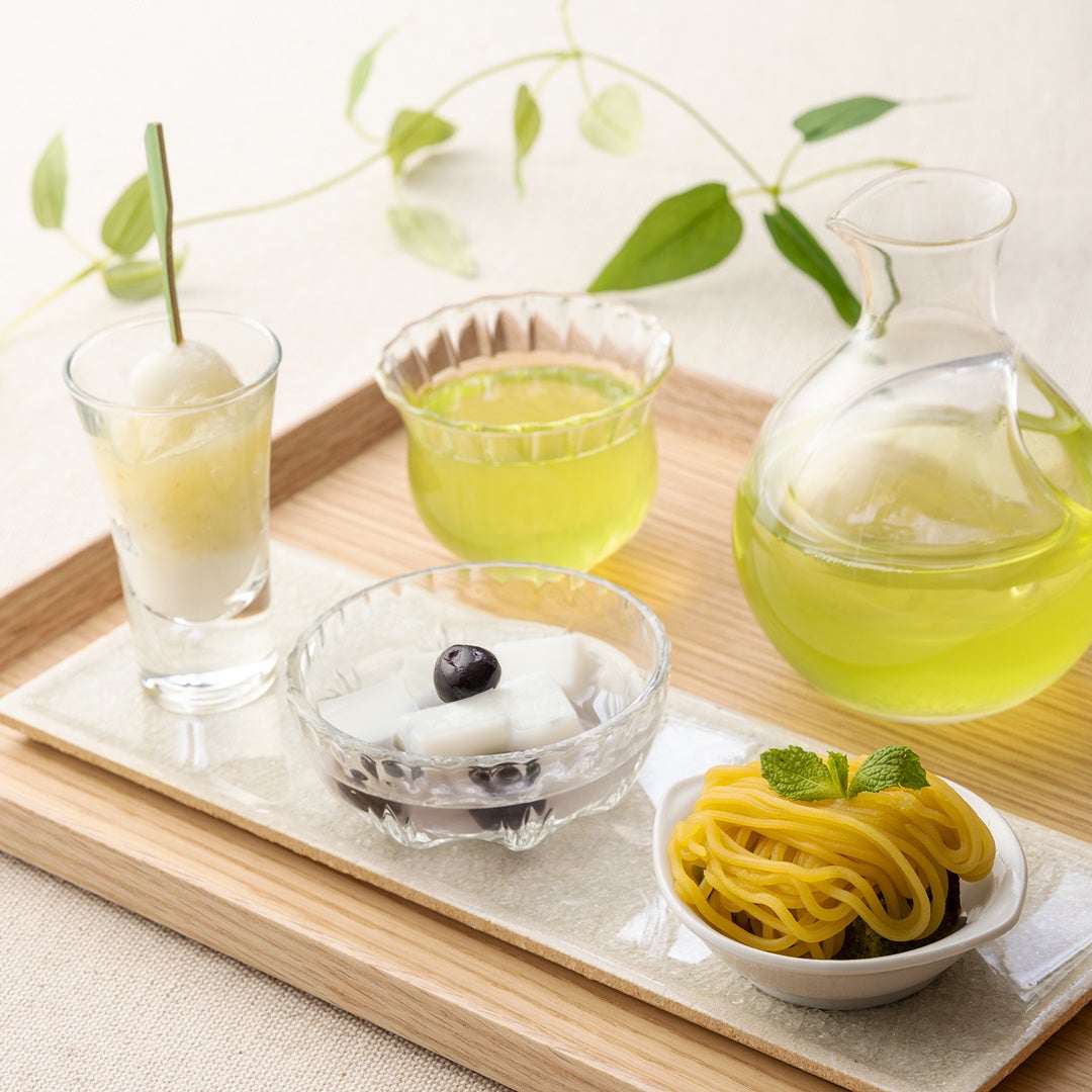 抹茶カステラを忍ばせたマンゴーのモンブラン、ブルーベリーを添えた杏仁豆腐、爽やかな青りんごソースをまとった白玉団子と水出し「冷煎茶」のセット。