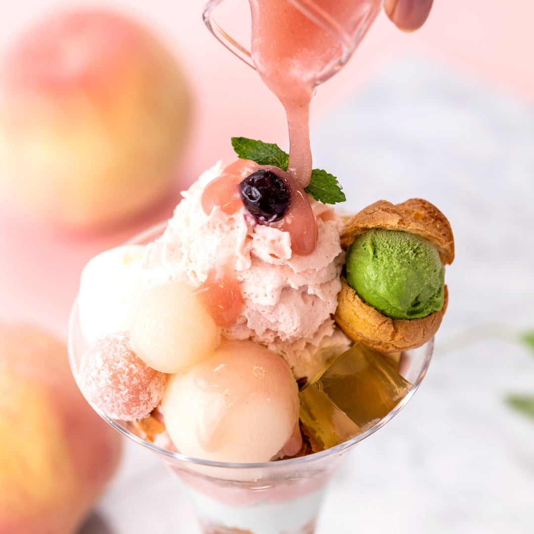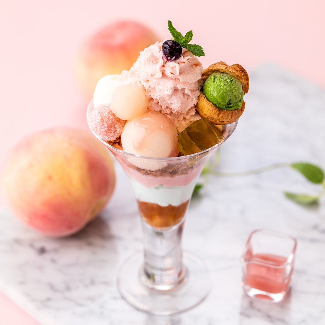 抹茶シューアイスや爽やかな冷煎茶ゼリーを贅沢にのせたパフェ「桃華」 。
