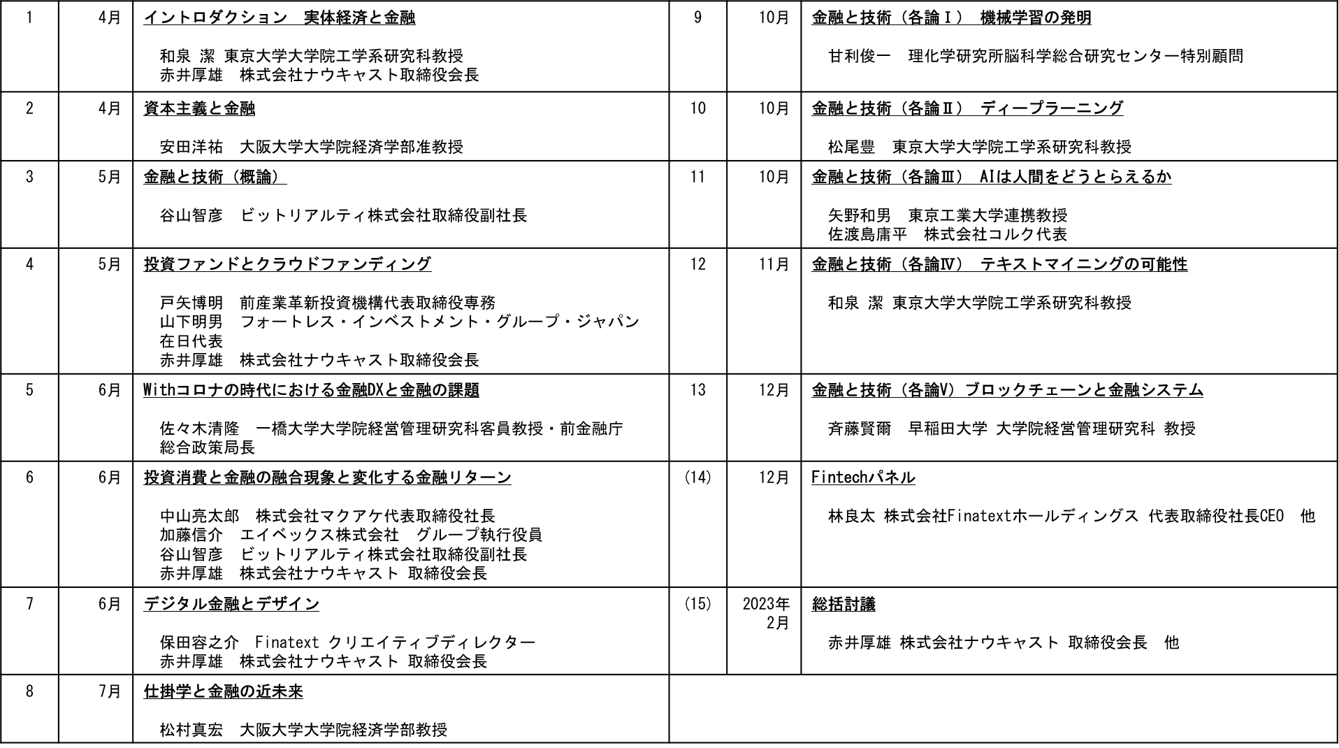 株式会社Finatextホールディングス(本社:東京都千代田区、代表取締役社長CEO:林 良太、以下「Finatextホールディングス」)は、近未来の金融システムを創る中核人材の育成を目的として2017年から開講している「近未来金融システム創造プログラム」(プログラム統括責任者:赤井厚雄)を2022年度も開講することをお知らせします。