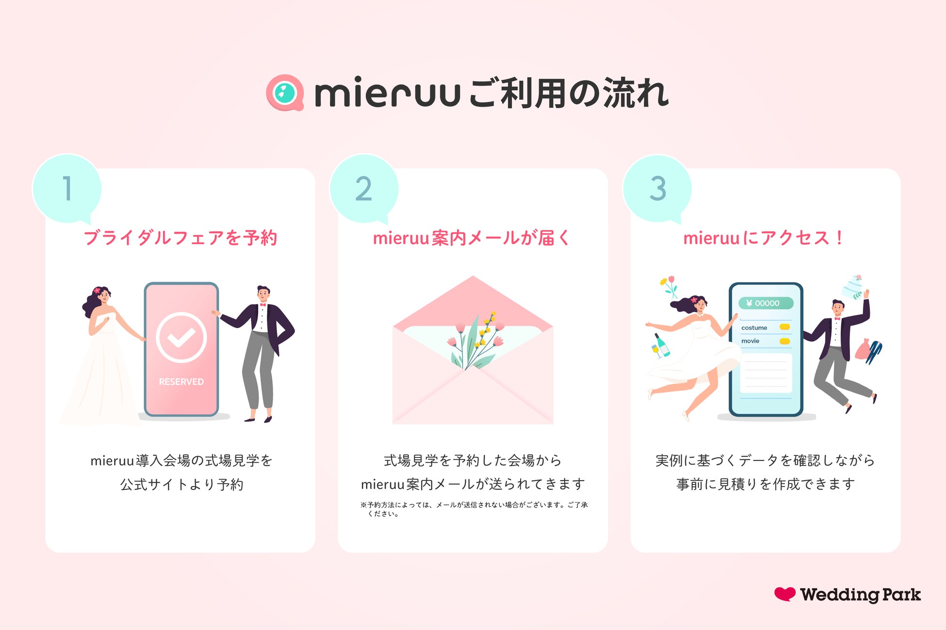 『mieruu(ミエルー)』は、結婚式場毎のリアルな料金データを活用し、式場見学前に消費者が自由に費用シミュレーションできるWEBサービスで、招待人数ごとの総額分布や見積項目(衣装、装花、料理など)ごとの料金分布データを参考に、オリジナルの見積作成が可能です。当社が会場ごとのリアルな料金データを提供し、ウエディングパークとともにサービス内容を企画、ウエディングパークがシステム開発を行いました。