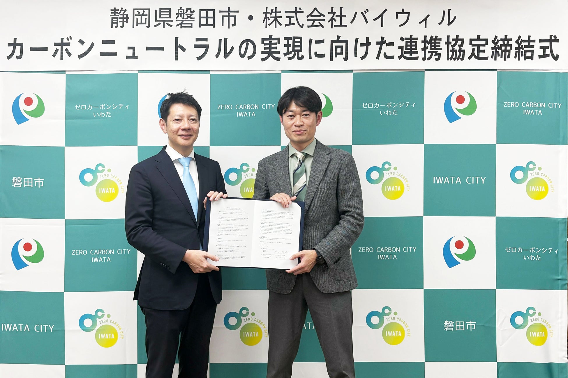 日本全国47都道府県のカーボンニュートラル実現を目指す株式会社バイウィル(本社:東京都中央区、代表取締役社長:下村 雄一郎、以下「バイウィル」)は、静岡県磐田市(市長:草地 博昭、以下「磐田市」)と、「磐田市と株式会社バイウィルとのカーボンニュートラルの実現に向けた連携協定」を締結しました。