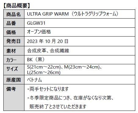 同商品は、『ULTRA GRIP』でご好評をいただいている、手のひら側全面にシリコーンプリント加工を施した強力なグリップ力はそのままに、甲側には「吸湿発熱素材+防風・防水フィルム+保温フリース素材」の3層構造の防寒機能生地を採用しています。また手のひら側にはソフトな合成皮革を2層構造にすることで、温かさと手入れ感の良さを追求しています。寒さ対策としての温かさに加え、グリップ力や手入れ感にもこだわることで、できる限り普段と変わらない着用感でプレーしたいというゴルファーの要望に応えた冬用グローブです。