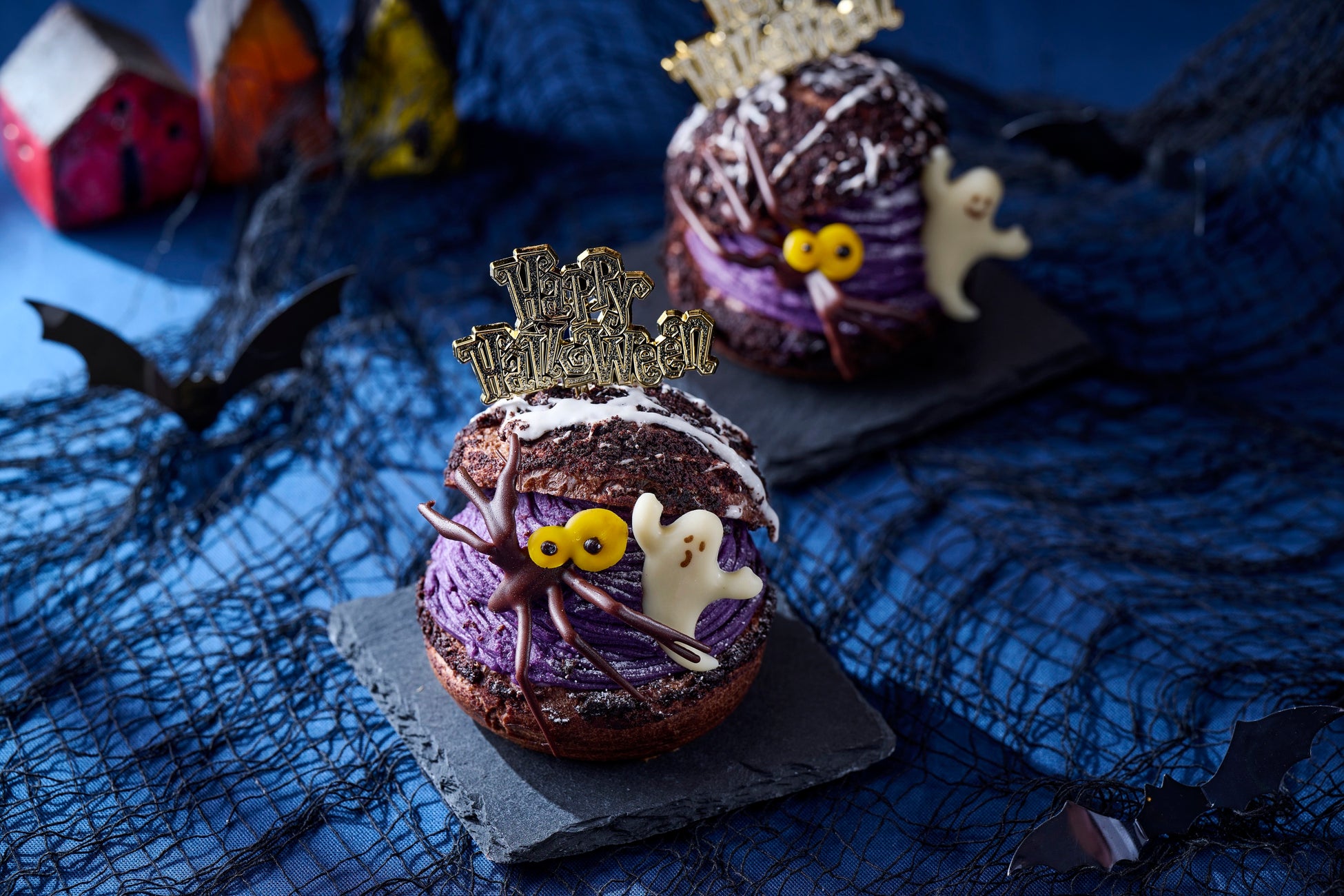 クモとおばけのチョコレートがキュートな、ハロウィーン仕様のシュークリームです。ココアの入ったシュー生地の間には、ダイスカットしたサツマイモをのせ、ハロウィーンカラーの紫芋クリームをたっぷり絞りました。