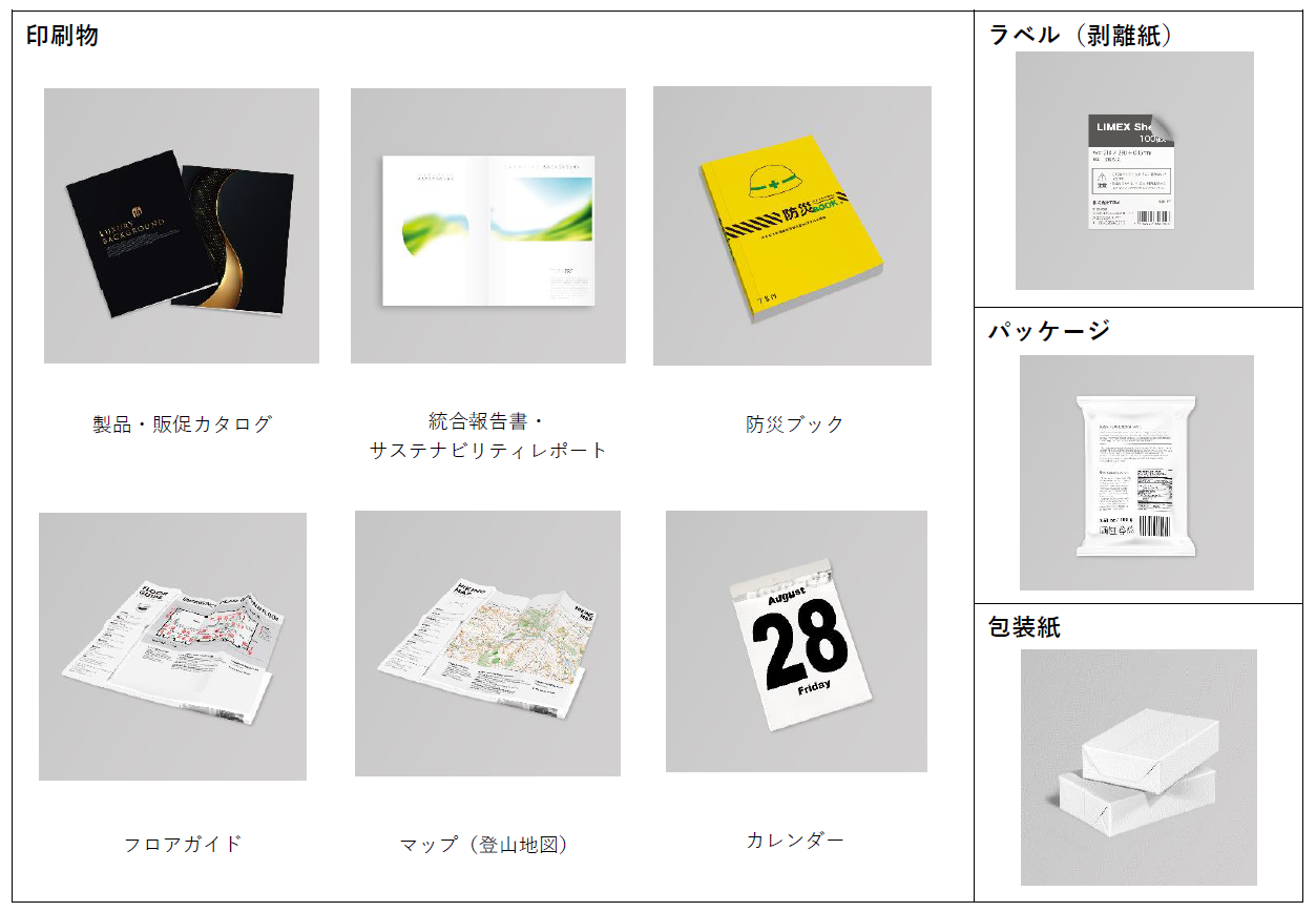 ・80μm:冊子、カレンダー、マップ、包装紙、圧着はがき、配送伝票、ラベル(開発中)、包装資材(開発中)等