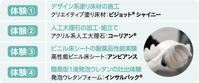 人気商品の施工方法や特性を実演を交えてご説明します。