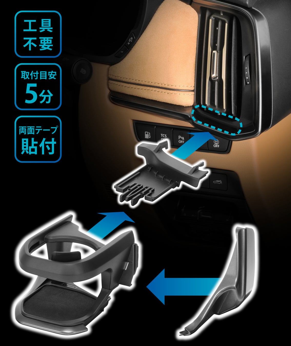 CX-60(CX-80)はエアコンフィンが縦方向かつ斜めにデザインされているため、汎用ホルダー(当社製)のようにエアコンフィンにフックを引っ掛ける方式ではドリンクが傾斜し安定しておくことができません。そこで本製品はフィンを使わず、専用ベースをエアコン吹き出し口下部に専用ベースで取り付けた後ホルダーを設置する取り付け方法を採用。また、両面テープで固定するため、工具不要でカンタンに取り付けることができます。