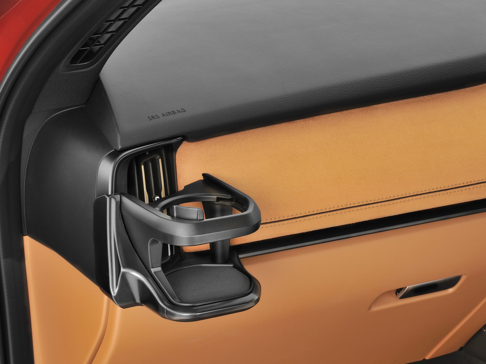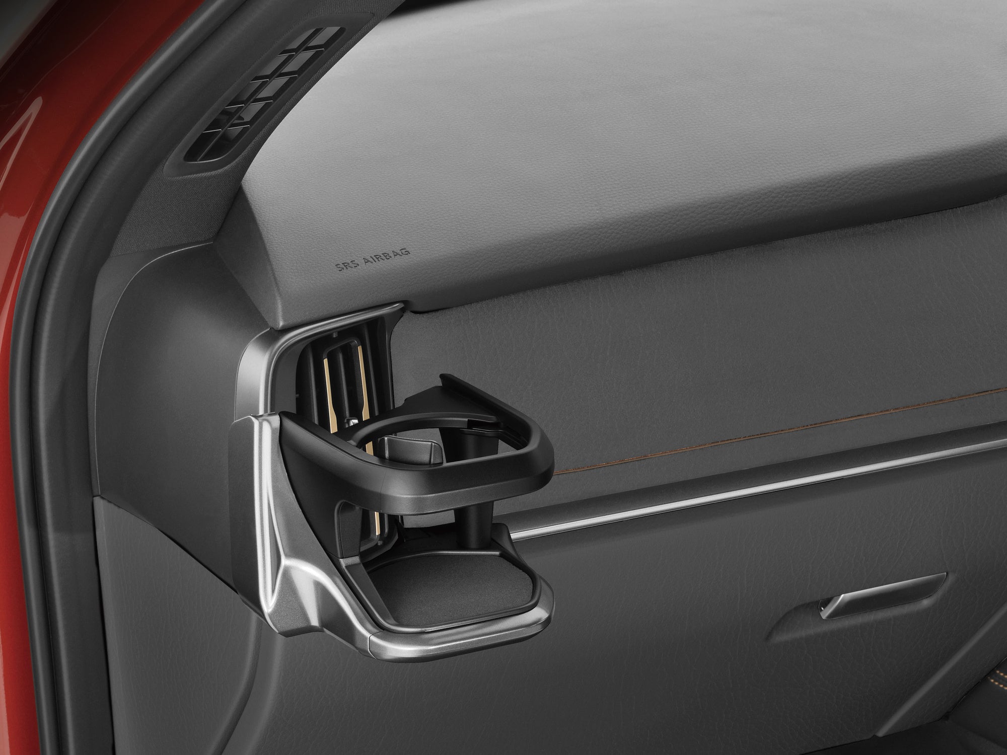 CX-60(CX-80)の内装デザインに合わせた専用設計。車両前席に見られる太い張り(R)と直線による力強いデザインに、自然につながるようなホルダーデザインを目指しました。可能な限り内装カラーと近づくよう調色しシボ加工を施し、特にエアコン吹き出し口のフレームカラーは高級感を意識してホルダー装着後も同調するよう仕上げました。また、運転席・助手席それぞれ異なる意匠となるため、合わせて設計しています(下画像参照)。
