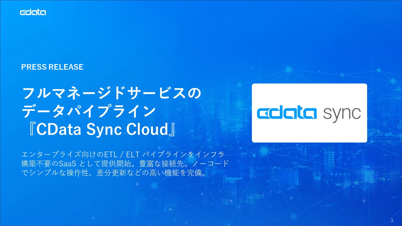 2024年5月13日、CData Software Japan 合同会社(本社:アメリカノースカロライナ州、日本オフィス:宮城県仙台市、代表社員 職務執行者:疋田 圭介、以下CData)は、データパイプラインサービス『CData Sync Cloud』をリリースしました。SaaS 提供のETL / ELT サービスであるCData Sync Cloud は、エンタープライズが必要とする豊富な接続先、ノーコードでシンプルな操作性、差分更新などの高い機能を備えたサービスとなっています。CData Sync Cloud により、SaaS を中心に業務アプリケーションを利用しているクラウド指向の企業が簡単にデータ基盤へのデータ収集を実現できるようになります。