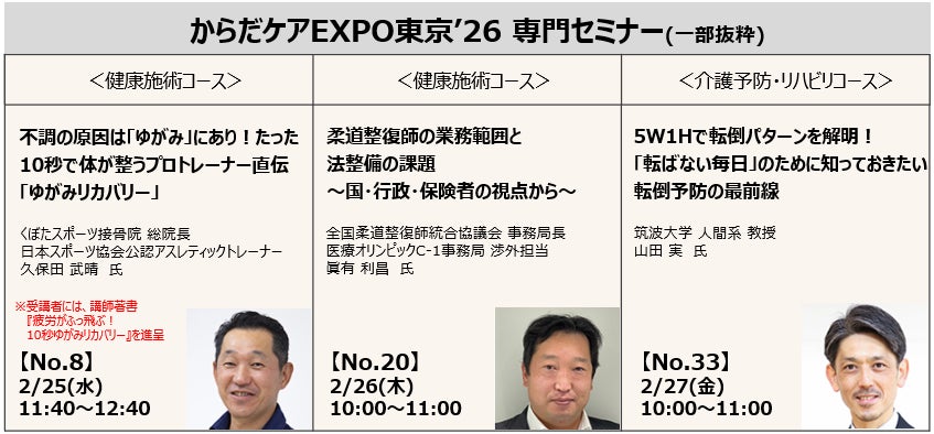 業界の第⼀線で活躍する専門家を講師に迎え「健康施術コース」「介護予防・リハビリコース」など15コース全45セッションの専門セミナーを同時開催する。健康施術コースではプロトレーナーによる体のゆがみを整えるメソッドを解説するほか、柔道整復師関連団体の幹部が法整備等の課題について講演。介護予防・リハビリコースでは5W1Hの転倒パターン分析に基づく転倒予防について解説するセッションなど、治療院・健康施術所の運営に役⽴つセミナーが目⽩押し。受講に必要な事前申込(無料) は、公式サイトにて受付中。定員間近のセッションもあるため、早めの受講申込をおすすめする。