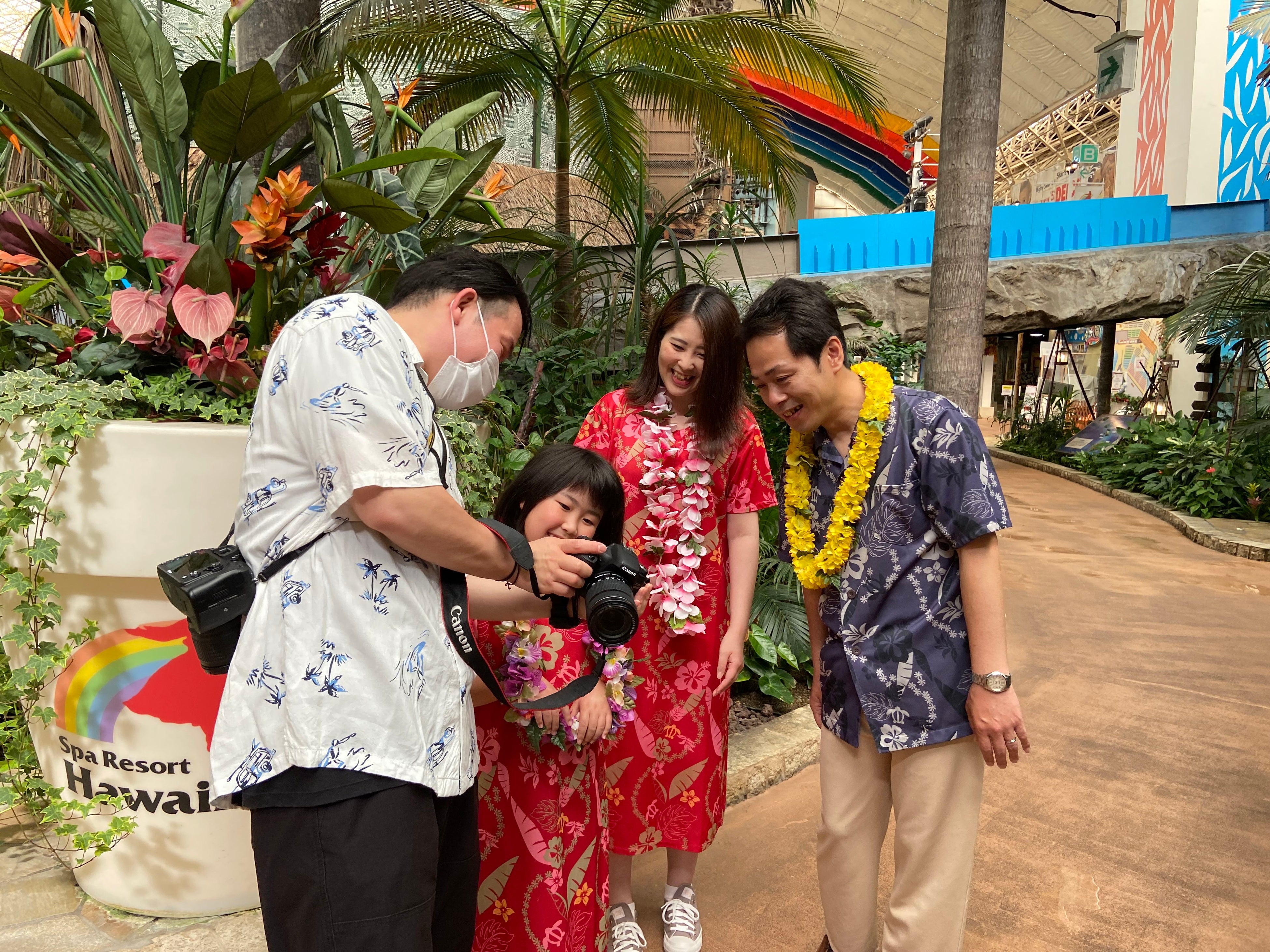 今回の「フォトツアー&思い出アルバムプラン」は、ハワイアンズの館内を熟知した専属カメラマンが同行し、ご希望を伺いながらおすすめスポットや写真映えするポーズの提案をいたします。撮影はカメラマンにお任せなので、家族やグループの全員がモデルとして参加。開園前のハワイアンズ館内を貸し切って行う撮影は、それ自体がプライスレスな体験です。