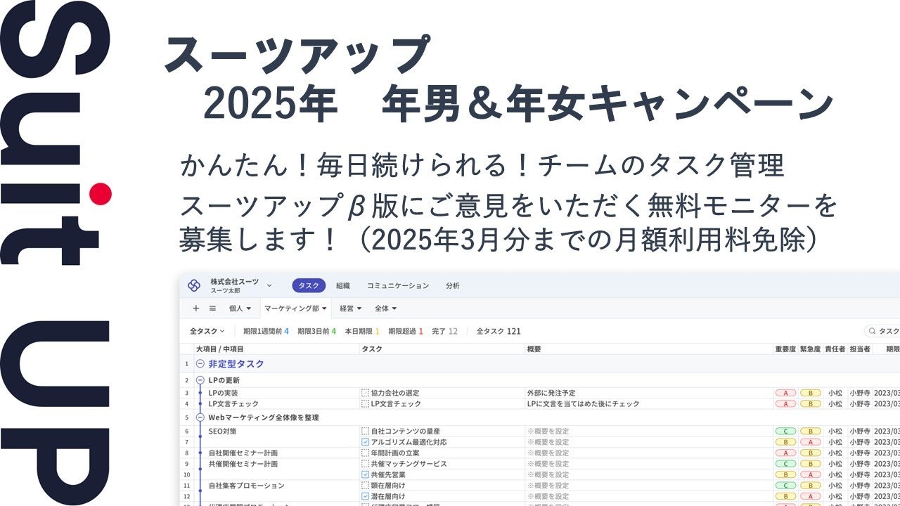 株式会社スーツ(所在地:東京都千代田区、代表取締役社長CEO:小松 裕介)は、チームでかんたん、毎日続けられるプロジェクト・タスク管理ツールの経営支援クラウド「Suit UP」(スーツアップ)において、2025年の干支「蛇」年生まれの年男&年女の方向けに無料モニター募集のキャンペーンを行います。