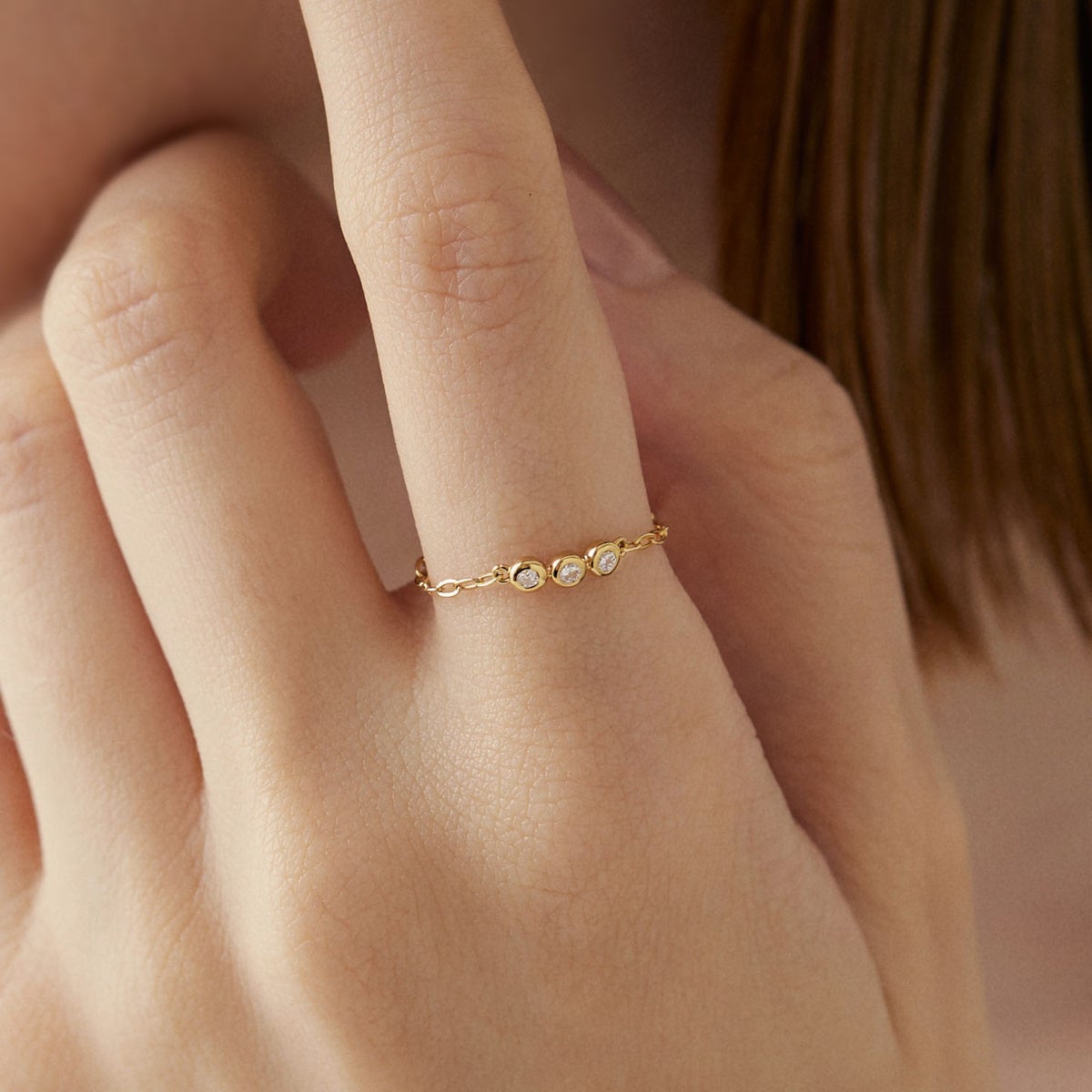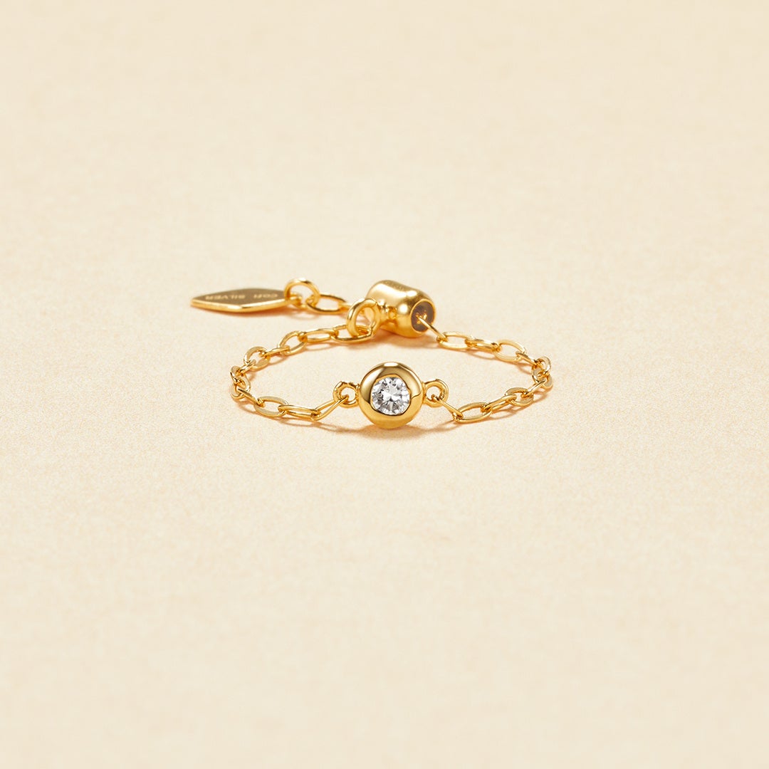 チェーンリングは、どの指にも合わせられるよう1~16号まで調整可能な仕様に。ラボグロウンダイヤモンドのクリーンな輝きが、手元を優しく彩ります。