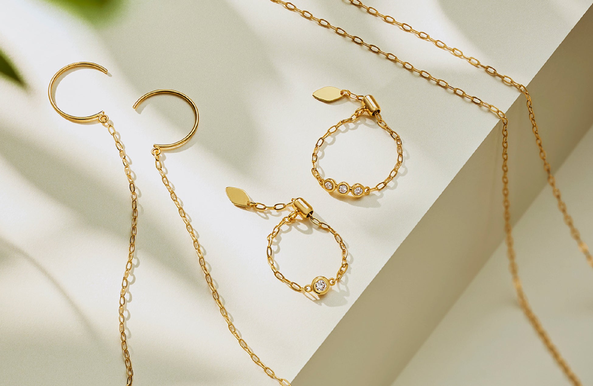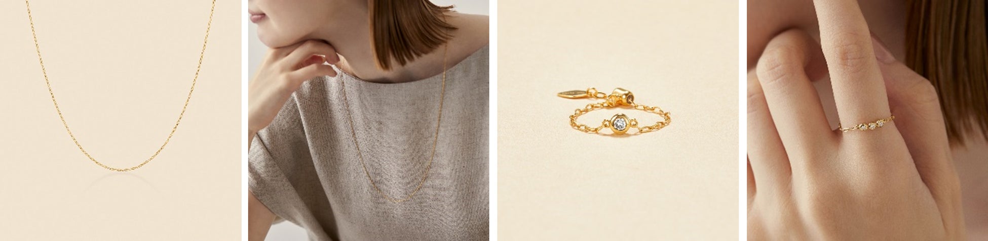 今回の新作は、身に着けるだけでこなれるチェーンコレクション。オケージョンや気分に合わせて長さを調整できるトレンドのチェーンネックレスや、指のサイズに合わせてサイズ調整ができるチェーンリング、動きに合わせて揺らめくロングチェーンが目を惹くピアスをご用意しました。
