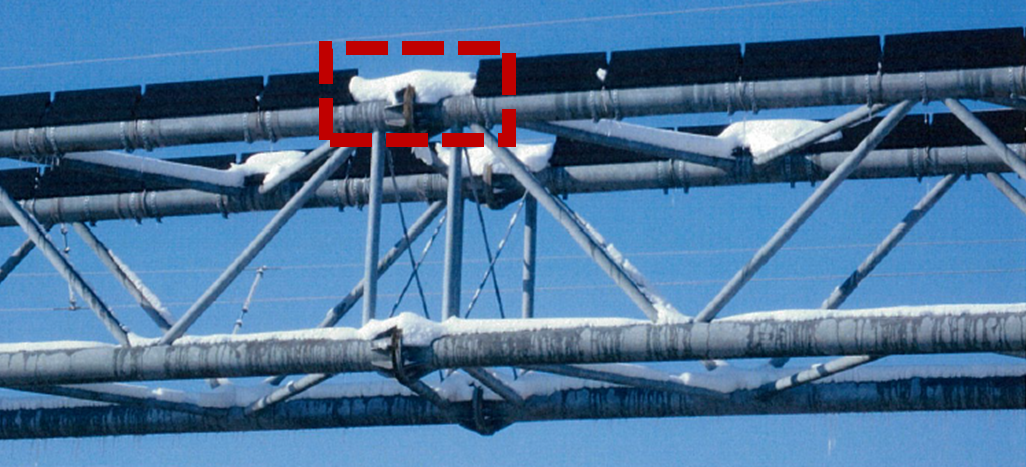 【例】NHルーフが設置できないような部位(横梁接続部や複数方向から部材が集まっている箇所、写真の赤枠部分)への着雪・堆雪対策の検討