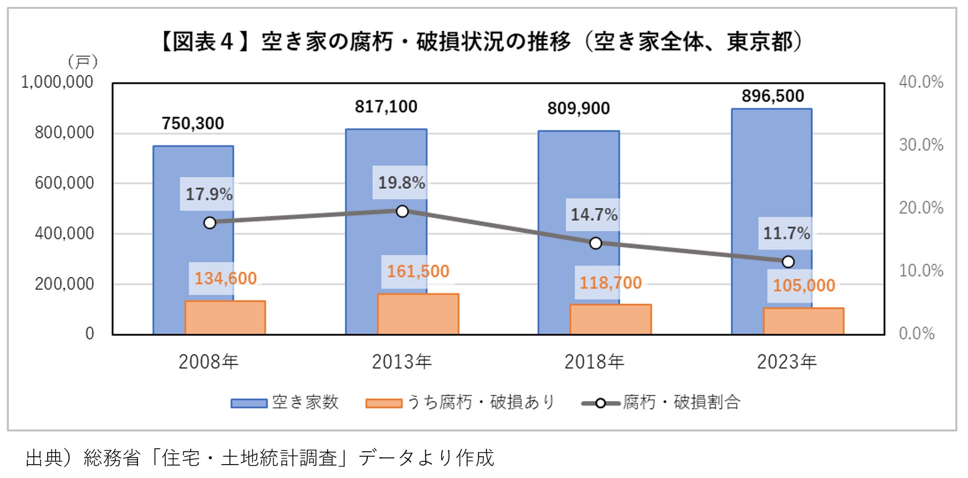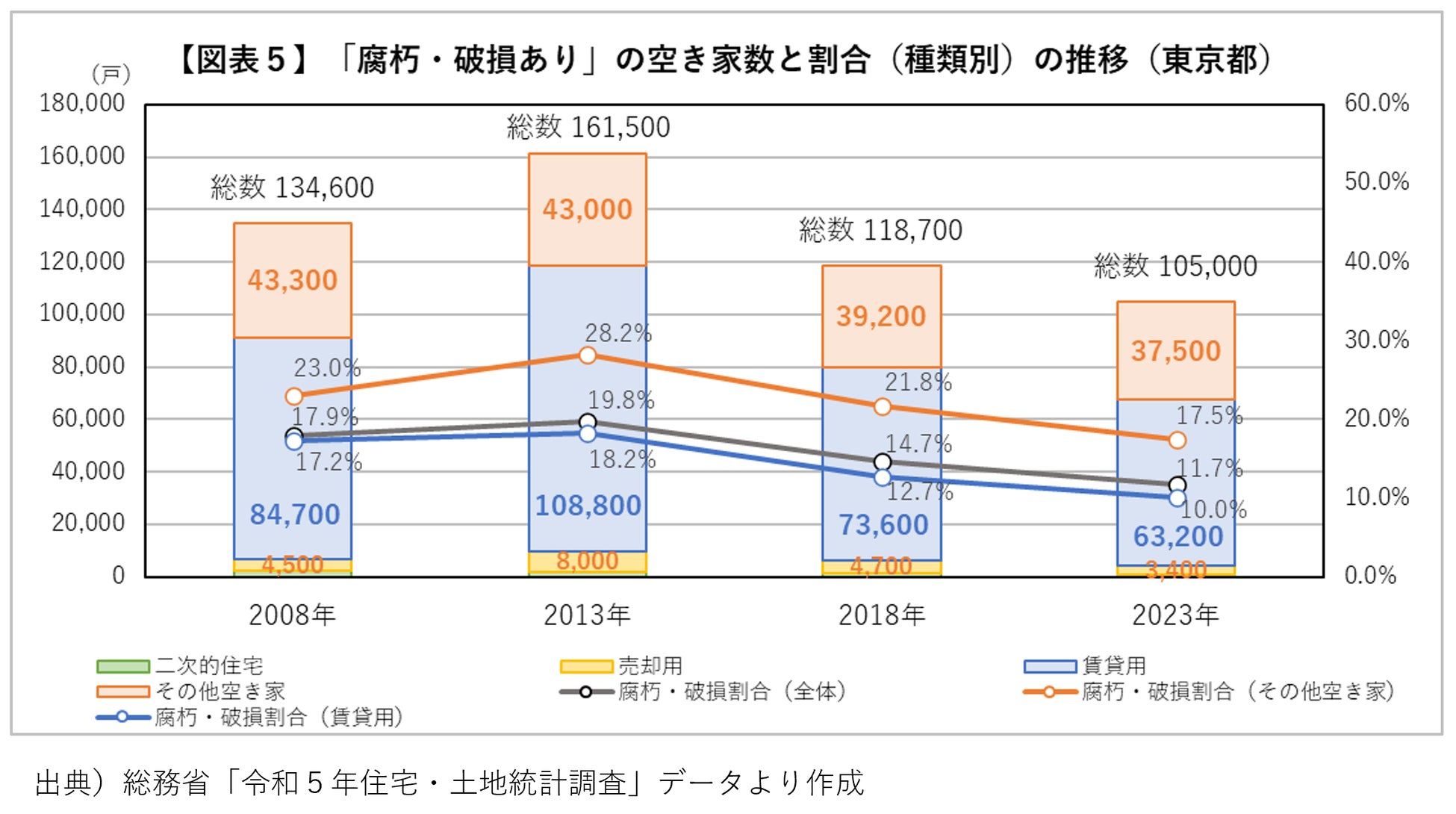 いる一方で、「腐朽・破損あり」の空き家数は、2013年の16万1,500戸から2023年の10万5,000戸へと減少し、 「腐朽・破損あり」の割合も19.8%から11.7%へと減少しています。ただし、「腐朽・破損あり」の空き家数は、2013~2018年の5年間は大きく減少したものの(16万1,500戸→11万8,700戸、26.5%減)、2018~2023年の5年間の減少数は低下傾向にあります(11万8,700戸→10万5,000戸、11.5%減)【図表4】。