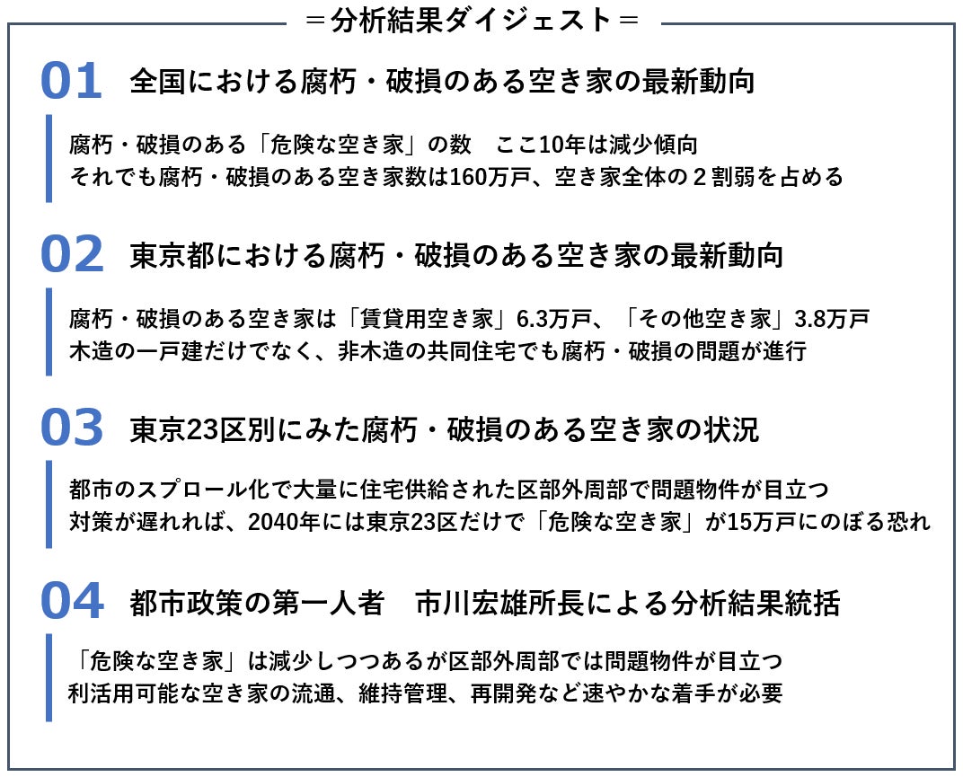 同研究所では、第31弾レポート「これからどうなる? 東京の空き家 ~23区別の空き家数・空き家率の傾向を詳細分析~」の続編として、将来的な危険度の高い腐朽・破損のある空き家について、全国と東京都、23区別の増減実態を分析した結果と今後の予測を紹介します。